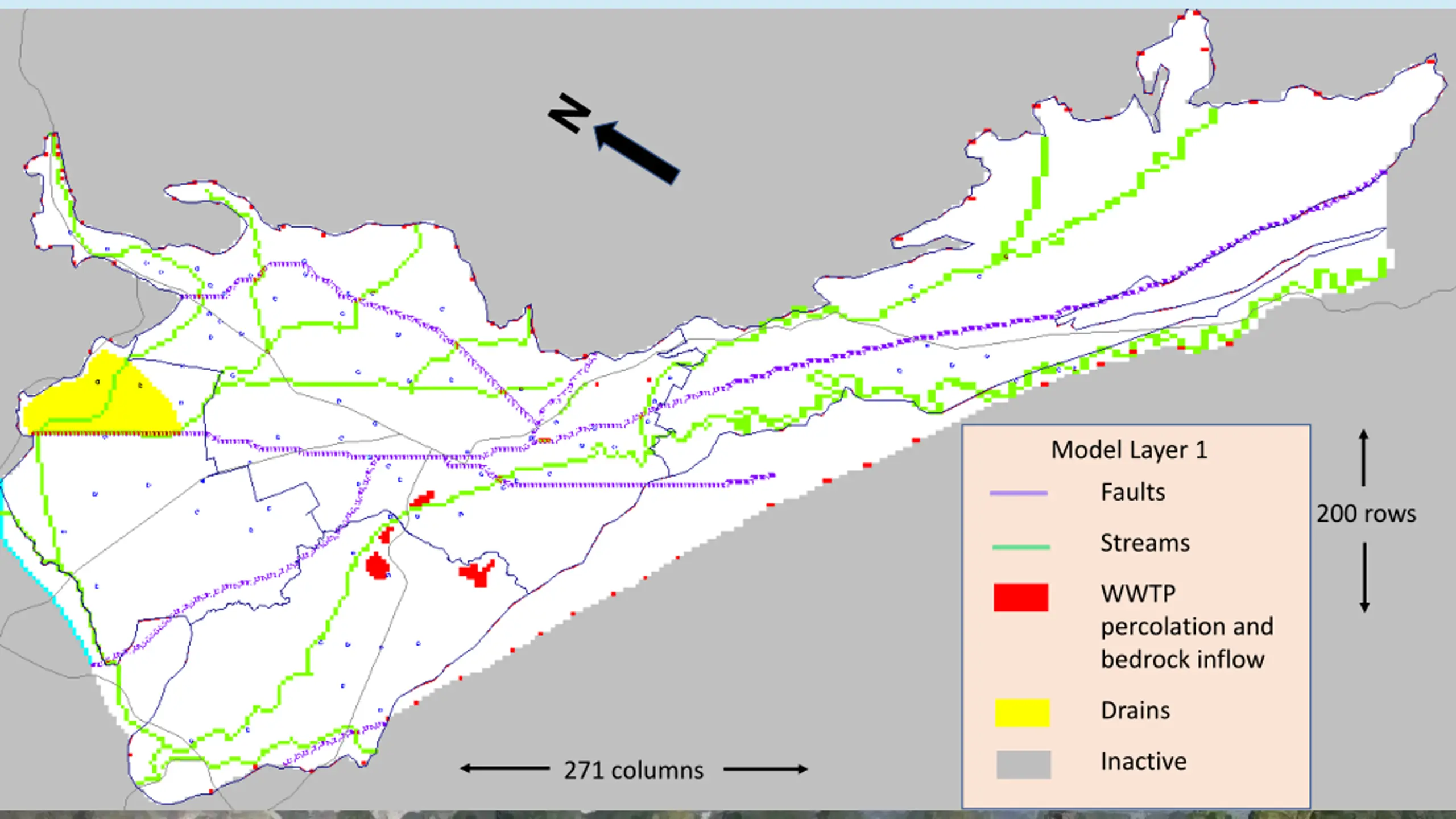 Numerical Model Numerical Model Model Layer 1 Faults 200 rows Streams WWTP percolation and bedrock inflow Drains Inactive 271 columns