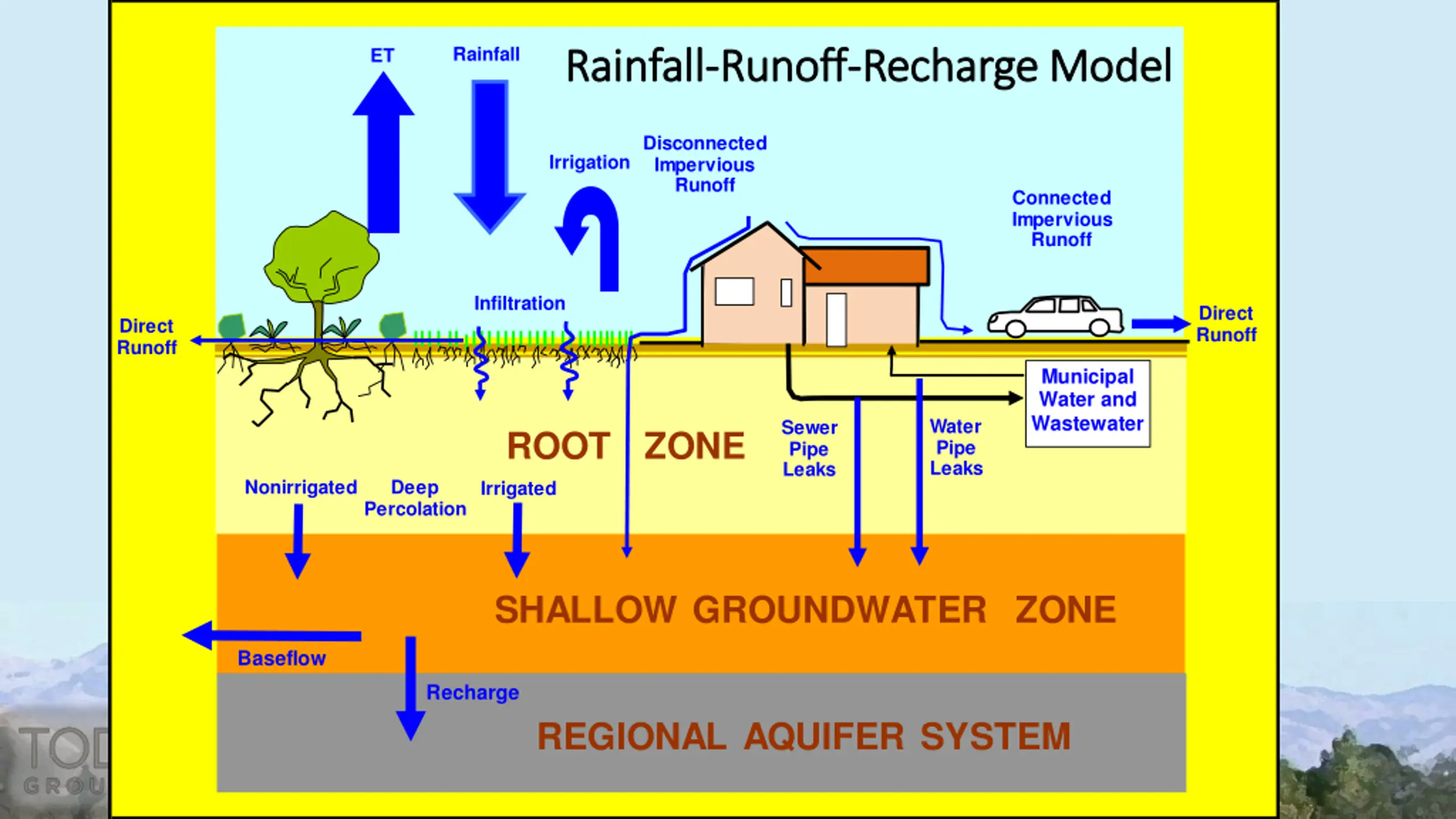 Rainfall ET Rainfall Rainfall- -Runoff Runoff- -Recharge Model Recharge Model Disconnected Impervious Runoff Irrigation Connected Impervious Runoff Infiltration Direct Runoff Direct Runoff Municipal Water and Wastewater Water Pipe Leaks Sewer Pipe Leaks ROOT ZONE Nonirrigated Deep Irrigated Percolation SHALLOW GROUNDWATER ZONE Baseflow Recharge REGIONAL AQUIFER SYSTEM