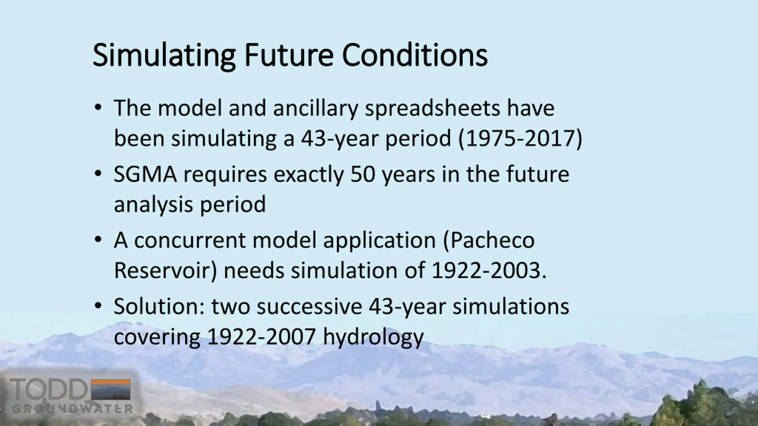 Simulating Future Conditions Simulating Future Conditions The model and ancillary spreadsheets have been simulating a 43-year period (1975-2017) SGMA requires exactly 50 years in the future analysis period A concurrent model application (Pacheco Reservoir) needs simulation of 1922-2003. Solution: two successive 43-year simulations covering 1922-2007 hydrology