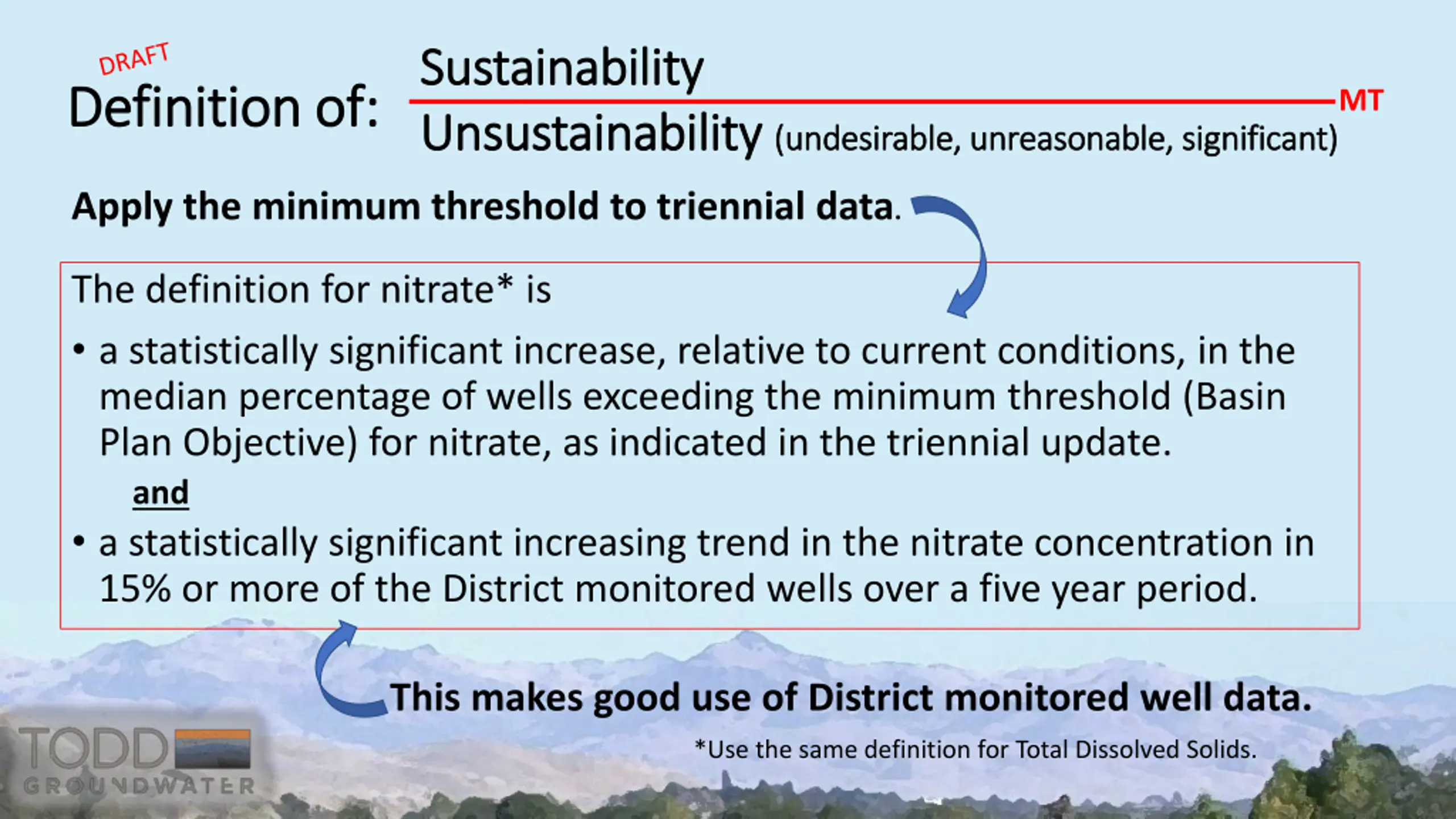 Sustainability Sustainability Unsustainability Unsustainability (undesirable, unreasonable, significant) (undesirable, unreasonable, significant) Definition of: Definition of: MT Apply the minimum threshold to triennial data. The definition for nitrate* is a statistically significant increase, relative to current conditions, in the median percentage of wells exceeding the minimum threshold (Basin Plan Objective) for nitrate, as indicated in the triennial update. and a statistically significant increasing trend in the nitrate concentration in 15% or more of the District monitored wells over a five year period. This makes good use of District monitored well data. *Use the same definition for Total Dissolved Solids.