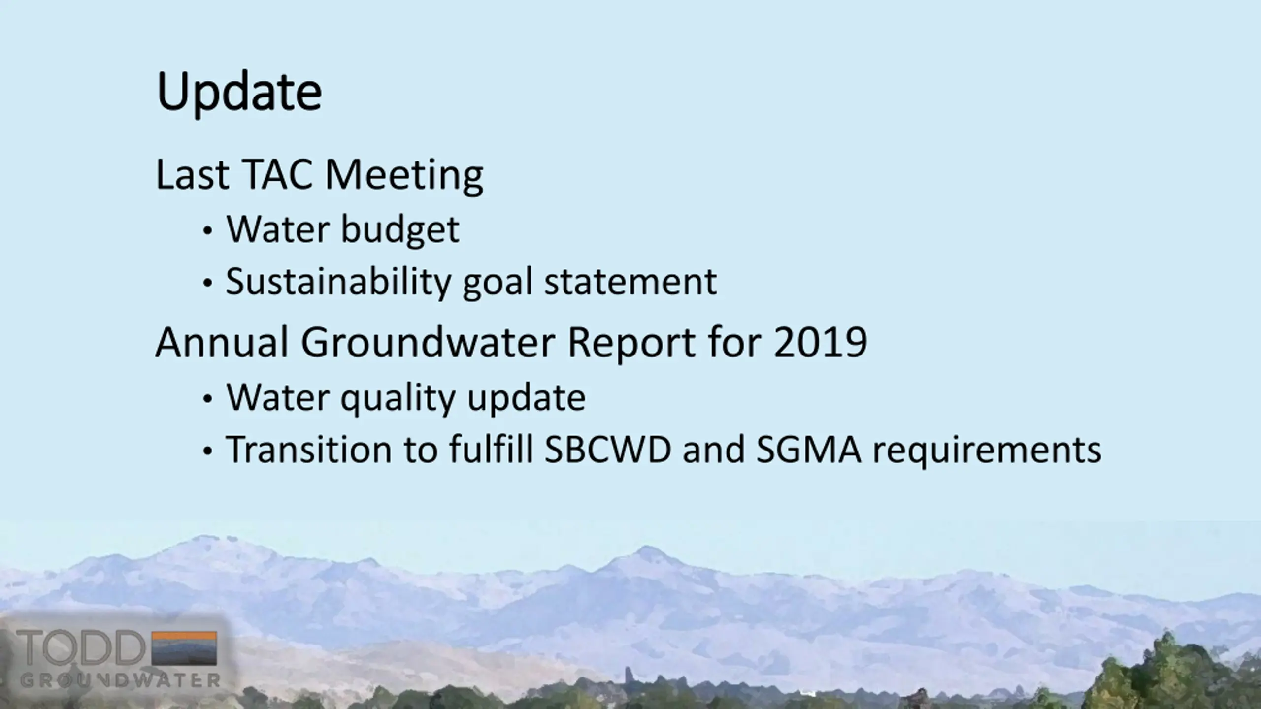 Update Update Last TAC Meeting Water budget Sustainability goal statement Annual Groundwater Report for 2019 Water quality update Transition to fulfill SBCWD and SGMA requirements