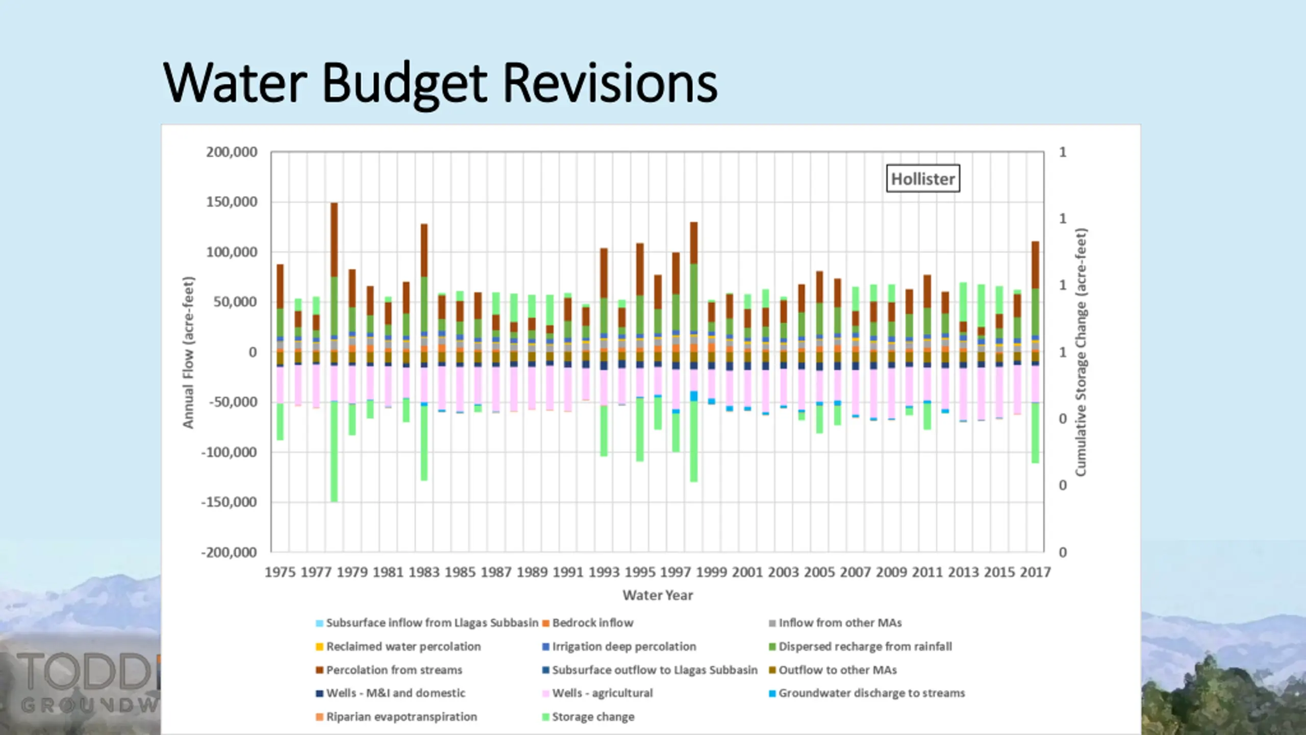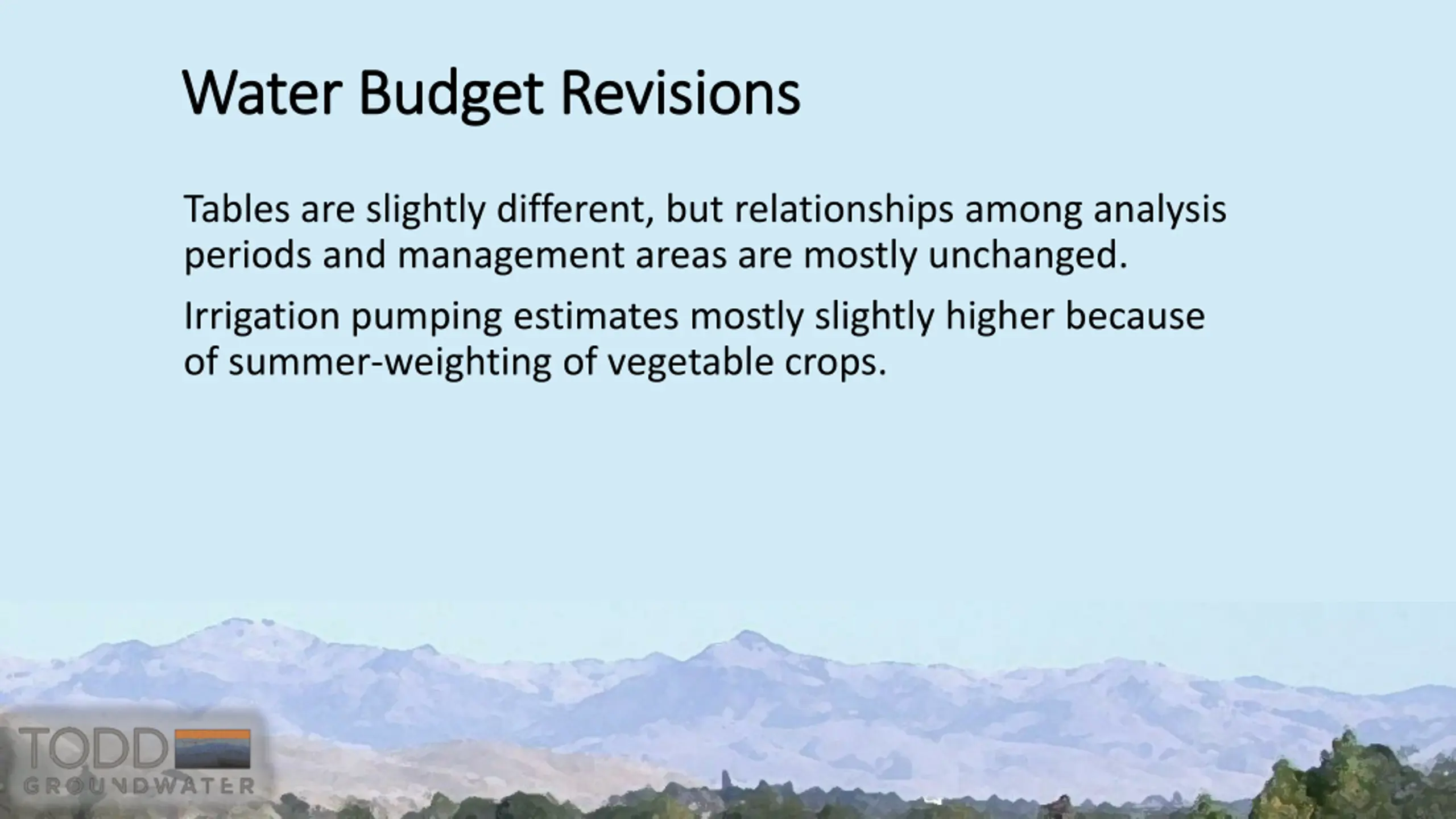 Water Budget Revisions Water Budget Revisions Tables are slightly different, but relationships among analysis periods and management areas are mostly unchanged. Irrigation pumping estimates mostly slightly higher because of summer-weighting of vegetable crops.
