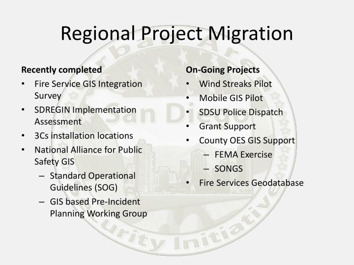 Regional Project Migration Recently completed Fire Service GIS Integration Survey SDREGIN Implementation Assessment 3Cs installation locations National Alliance for Public Safety GIS Standard Operational Guidelines (SOG) GIS based Pre-Incident Planning Working Group On-Going Projects Wind Streaks Pilot Mobile GIS Pilot SDSU Police Dispatch Grant Support County OES GIS Support FEMA Exercise SONGS Fire Services Geodatabase