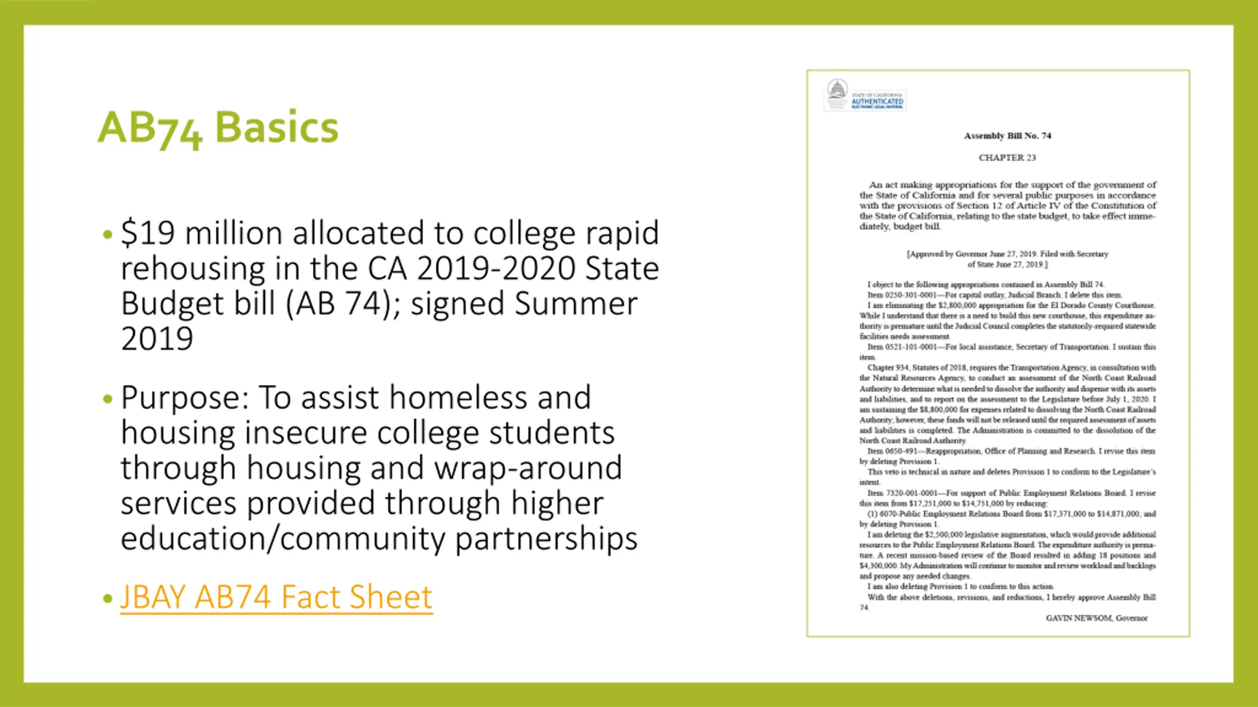 AB74 Basics $19 million allocated to college rapid rehousing in the CA 2019-2020 State Budget bill (AB 74); signed Summer 2019 Purpose: To assist homeless and housing insecure college students through housing and wrap-around services provided through higher education/community partnerships JBAY AB74 Fact Sheet