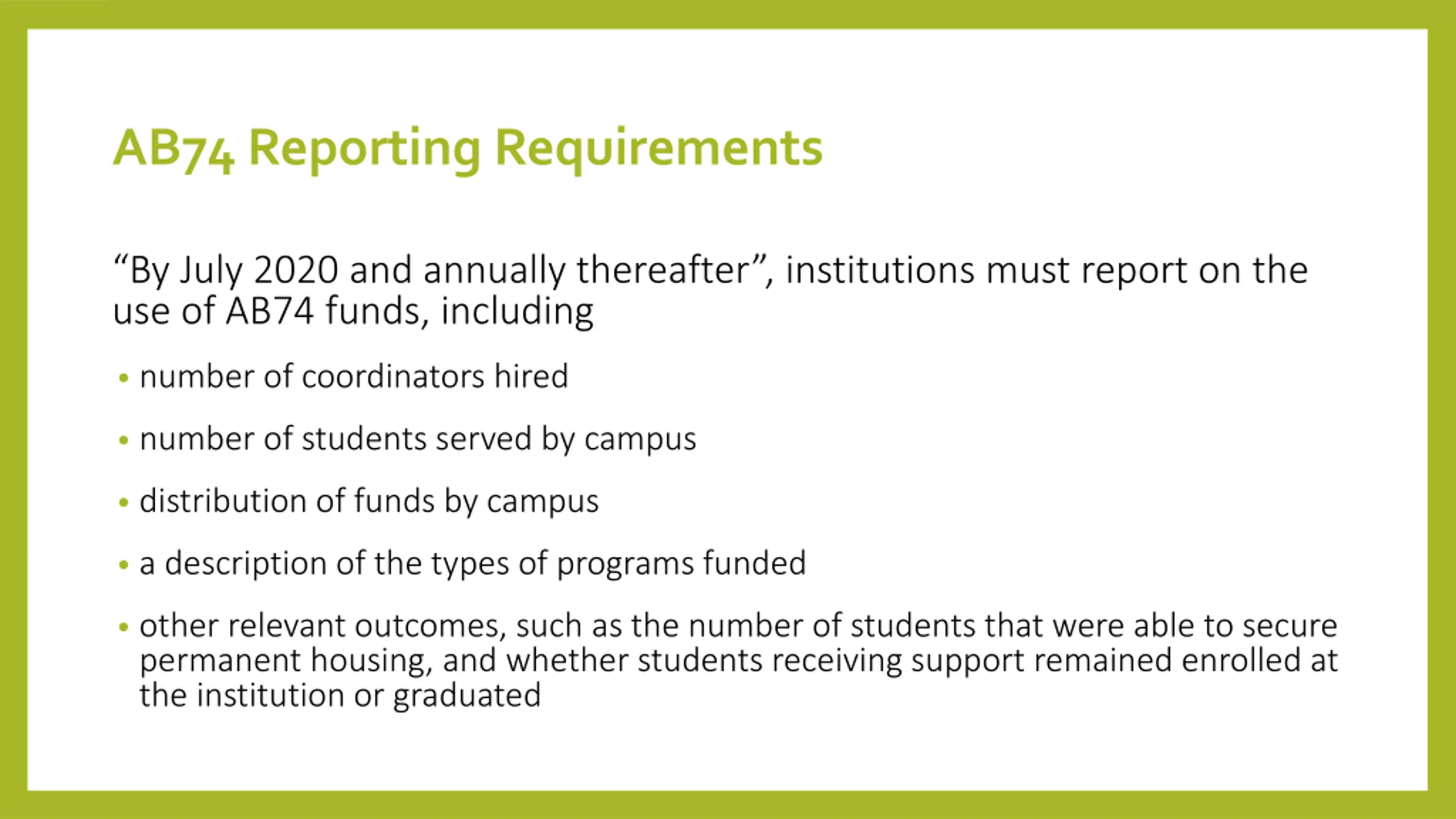 AB74 Reporting Requirements By July 2020 and annually thereafter , institutions must report on the use of AB74 funds, including number of coordinators hired number of students served by campus distribution of funds by campus a description of the types of programs funded other relevant outcomes, such as the number of students that were able to secure permanent housing, and whether students receiving support remained enrolled at the institution or graduated