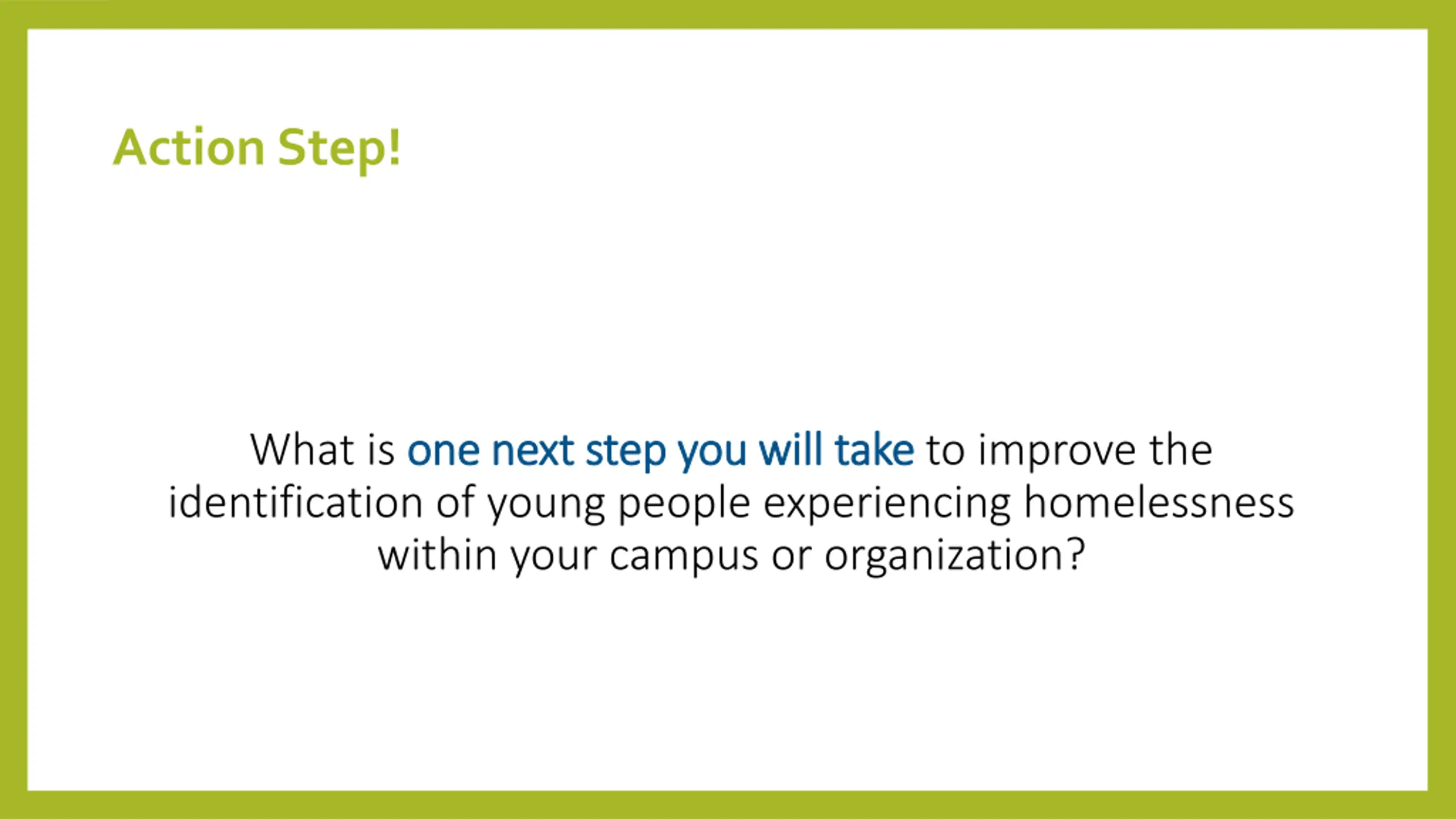 Action Step! What is one next step you will take one next step you will take to improve the identification of young people experiencing homelessness within your campus or organization?