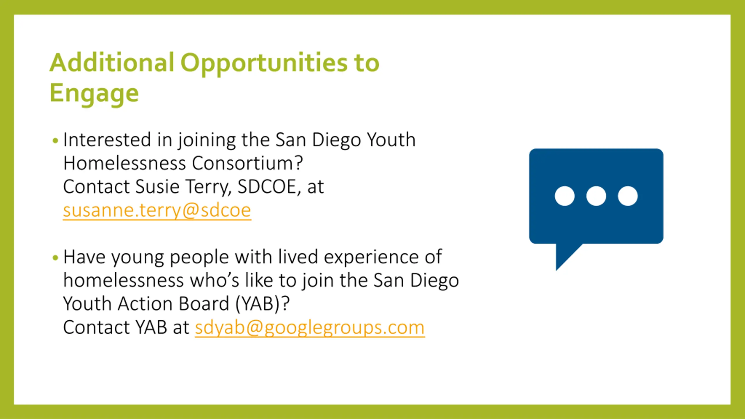 Additional Opportunities to Engage Interested in joining the San Diego Youth Homelessness Consortium? Contact Susie Terry, SDCOE, at susanne.terry@sdcoe Have young people with lived experience of homelessness who s like to join the San Diego Youth Action Board (YAB)? Contact YAB at sdyab@googlegroups.com