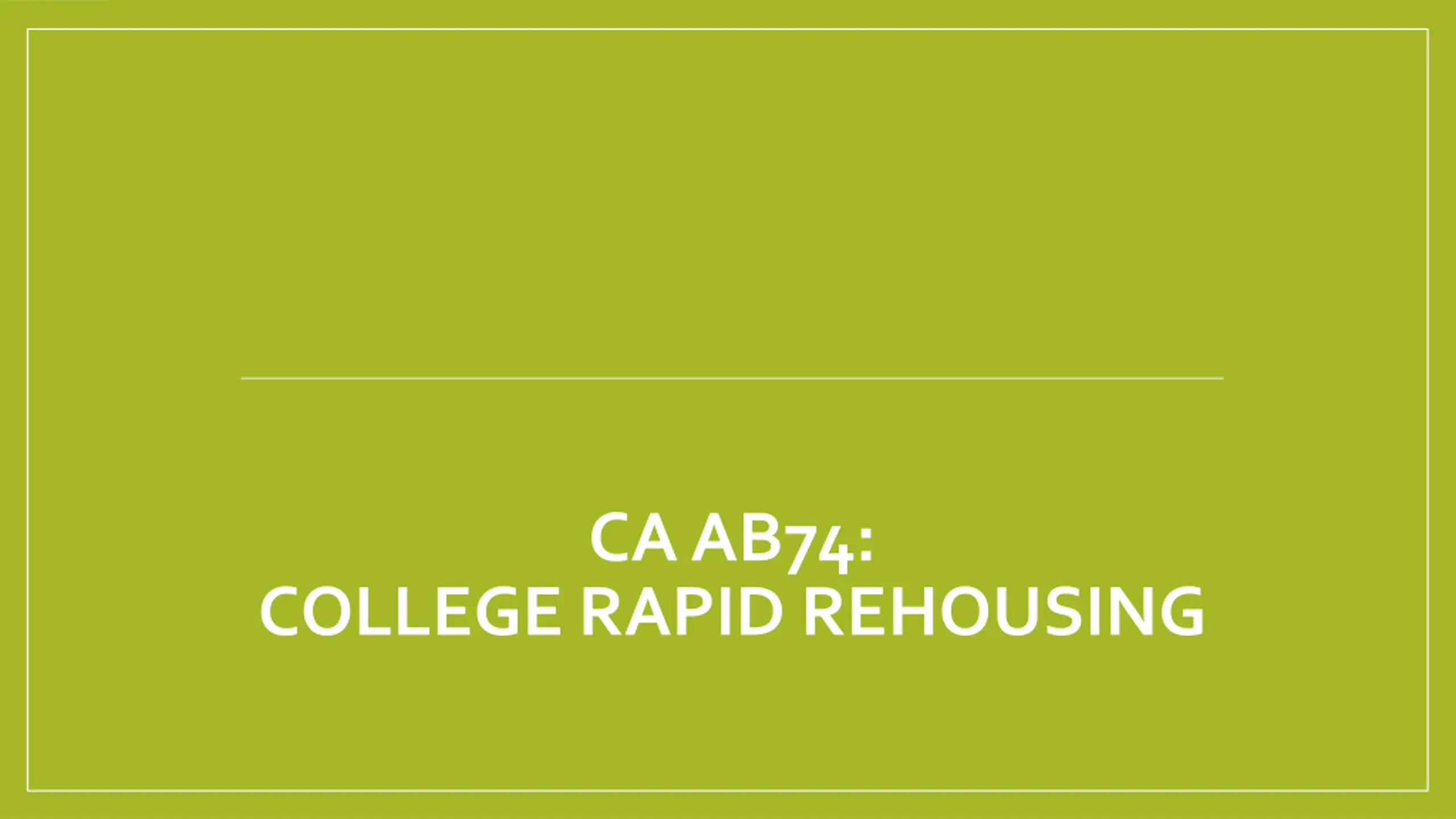 AB74 Purpose and Vision Address the permanent housing needs of students experiencing homelessness Create long-term solutions that end homelessness for students and support college retention and success Develop evidence for the efficacy of college focused rapid rehousing as a pathway to expanded funding