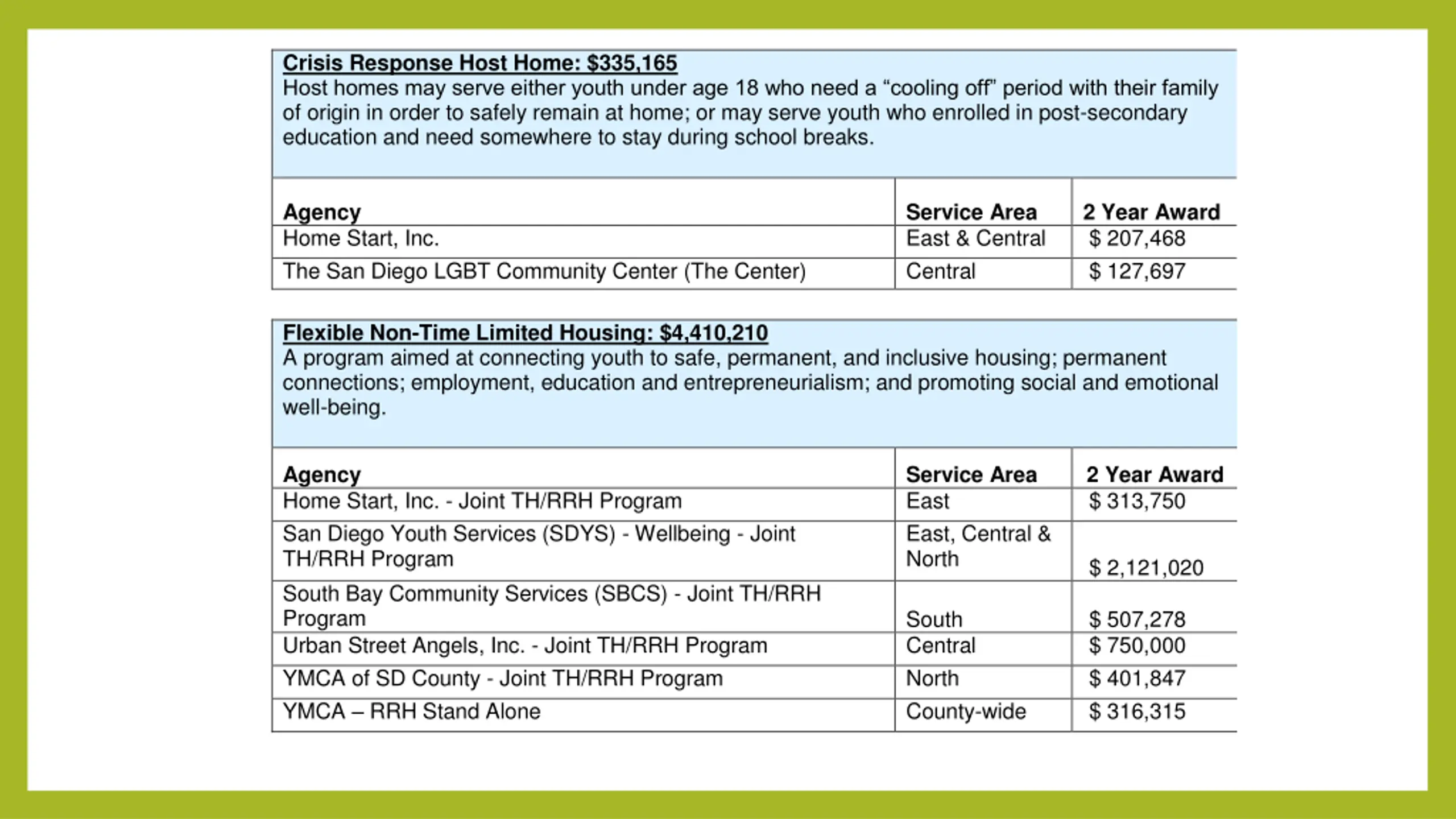 Crisis Response Host Home: $335,165 Host homes may serve either youth under age 18 who need a cooling off period with their family of origin in order to safely remain at home; or may serve youth who enrolled in post-secondary education and need somewhere to stay during school breaks. Agency Home Start, Inc. The San Diego LGBT Community Center (The Center) Service Area East & Central Central 2 Year Award $ 207,468 $ 127,697 Flexible Non-Time Limited Housing: $4,410,210 A program aimed at connecting youth to safe, permanent, and inclusive housing; permanent connections; employment, education and entrepreneurialism; and promoting social and emotional well-being. Agency Home Start, Inc. - Joint TH/RRH Program San Diego Youth Services (SDYS) - Wellbeing - Joint TH/RRH Program South Bay Community Services (SBCS) - Joint TH/RRH Program Urban Street Angels, Inc. - Joint TH/RRH Program YMCA of SD County - Joint TH/RRH Program YMCA RRH Stand Alone Service Area East East, Central & North 2 Year Award $ 313,750 $ 2,121,020 South Central North County-wide $ 507,278 $ 750,000 $ 401,847 $ 316,315