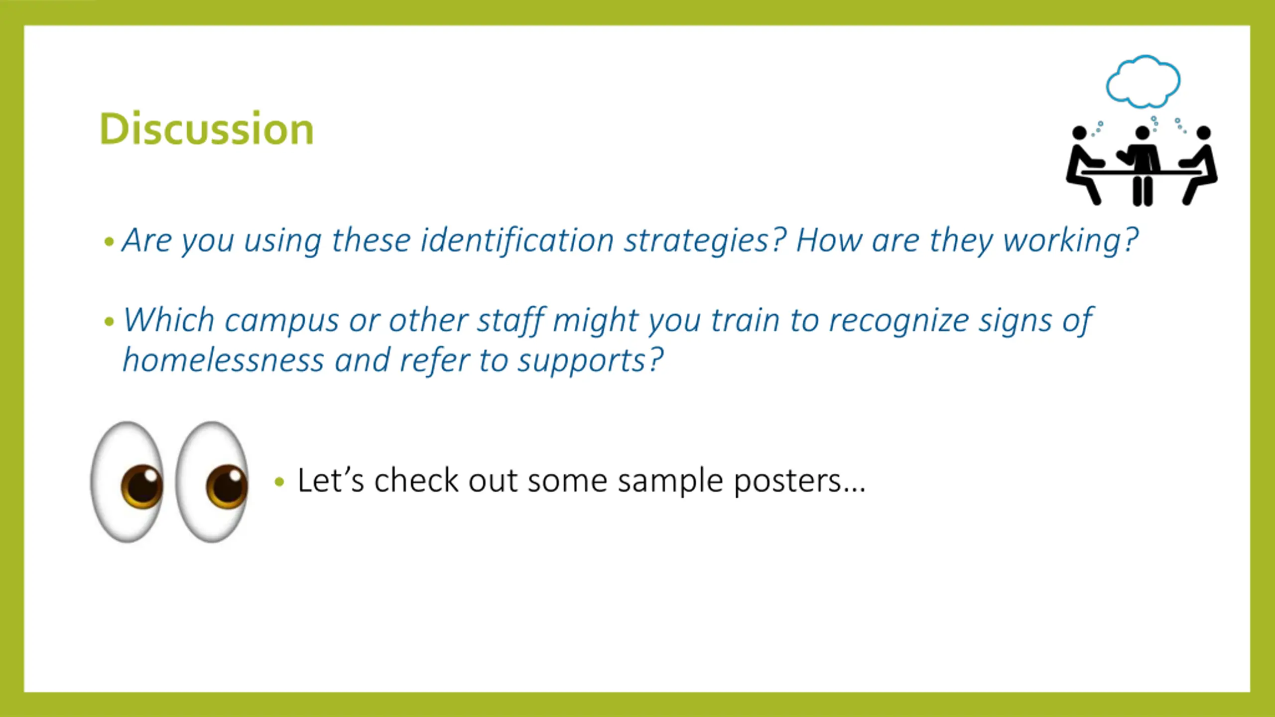 Discussion Are you using these identification strategies? How are they working? Which campus or other staff might you train to recognize signs of homelessness and refer to supports? Let s check out some sample posters