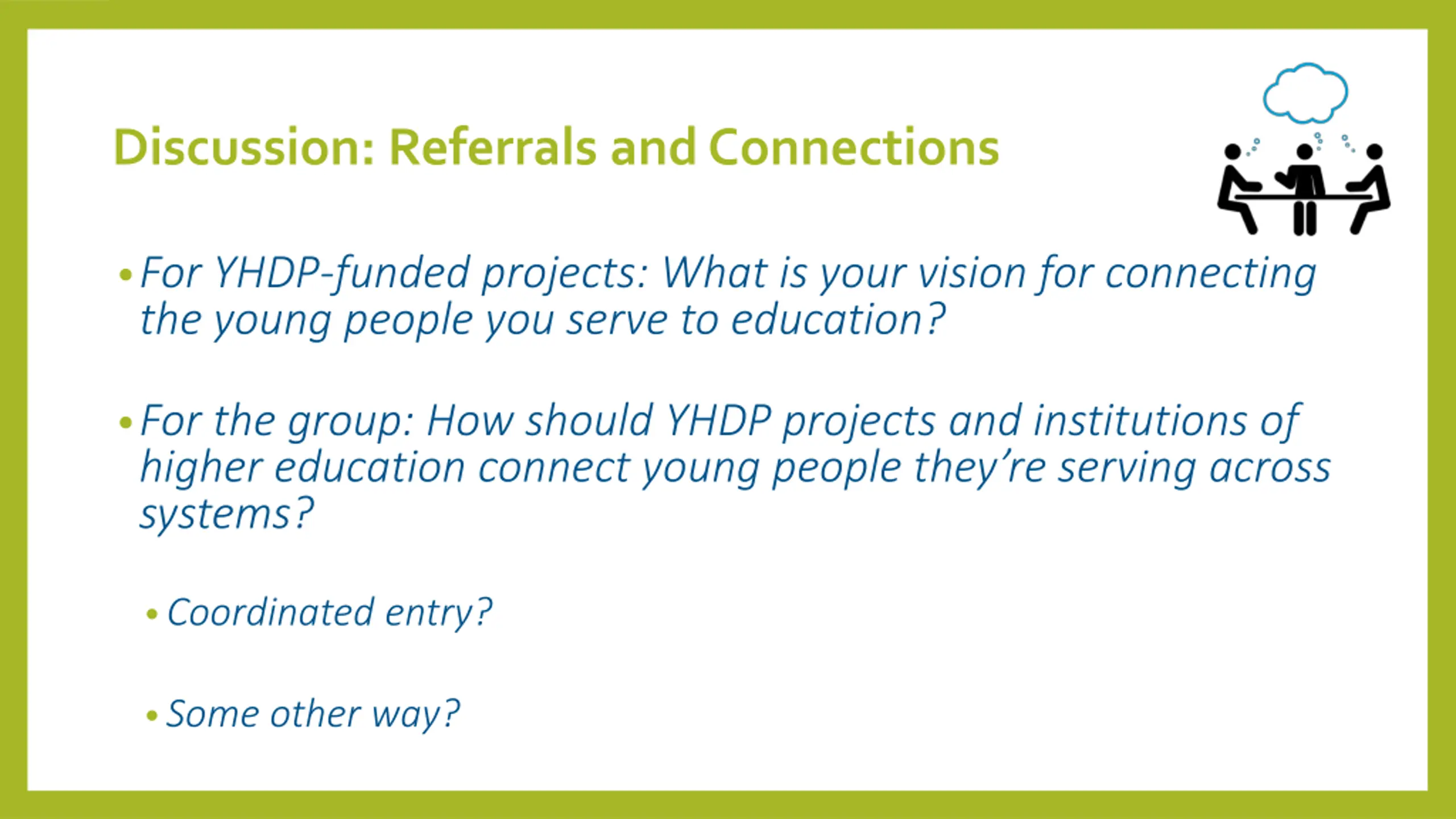 Discussion: Referrals and Connections For YHDP-funded projects: What is your vision for connecting the young people you serve to education? For the group: How should YHDP projects and institutions of higher education connect young people they re serving across systems? Coordinated entry? Some other way?