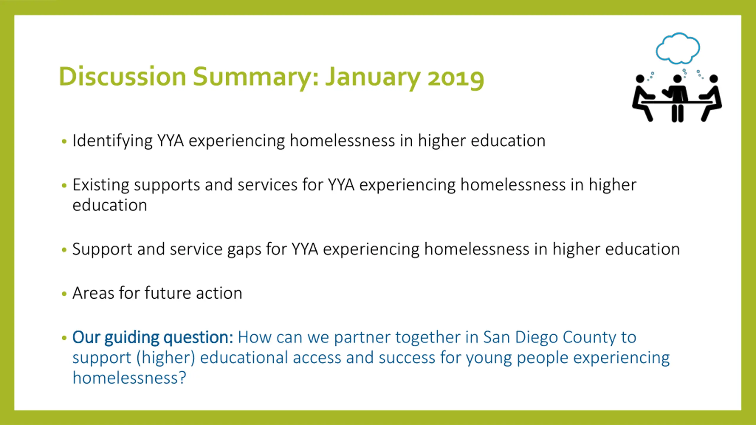 Discussion Summary: January 2019 Identifying YYA experiencing homelessness in higher education Existing supports and services for YYA experiencing homelessness in higher education Support and service gaps for YYA experiencing homelessness in higher education Areas for future action Our guiding question: Our guiding question: How can we partner together in San Diego County to support (higher) educational access and success for young people experiencing homelessness?