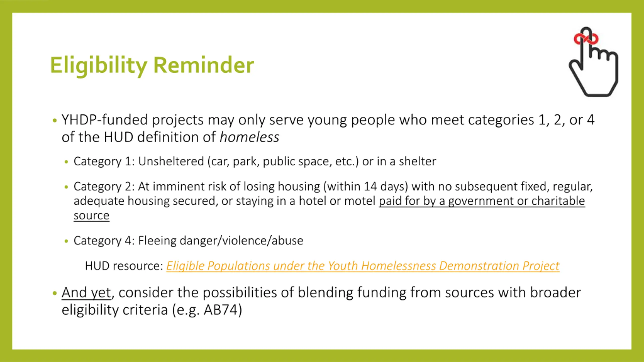 Eligibility Reminder YHDP-funded projects may only serve young people who meet categories 1, 2, or 4 of the HUD definition of homeless Category 1: Unsheltered (car, park, public space, etc.) or in a shelter Category 2: At imminent risk of losing housing (within 14 days) with no subsequent fixed, regular, adequate housing secured, or staying in a hotel or motel paid for by a government or charitable source Category 4: Fleeing danger/violence/abuse HUD resource: Eligible Populations under the Youth Homelessness Demonstration Project And yet, consider the possibilities of blending funding from sources with broader eligibility criteria (e.g. AB74)