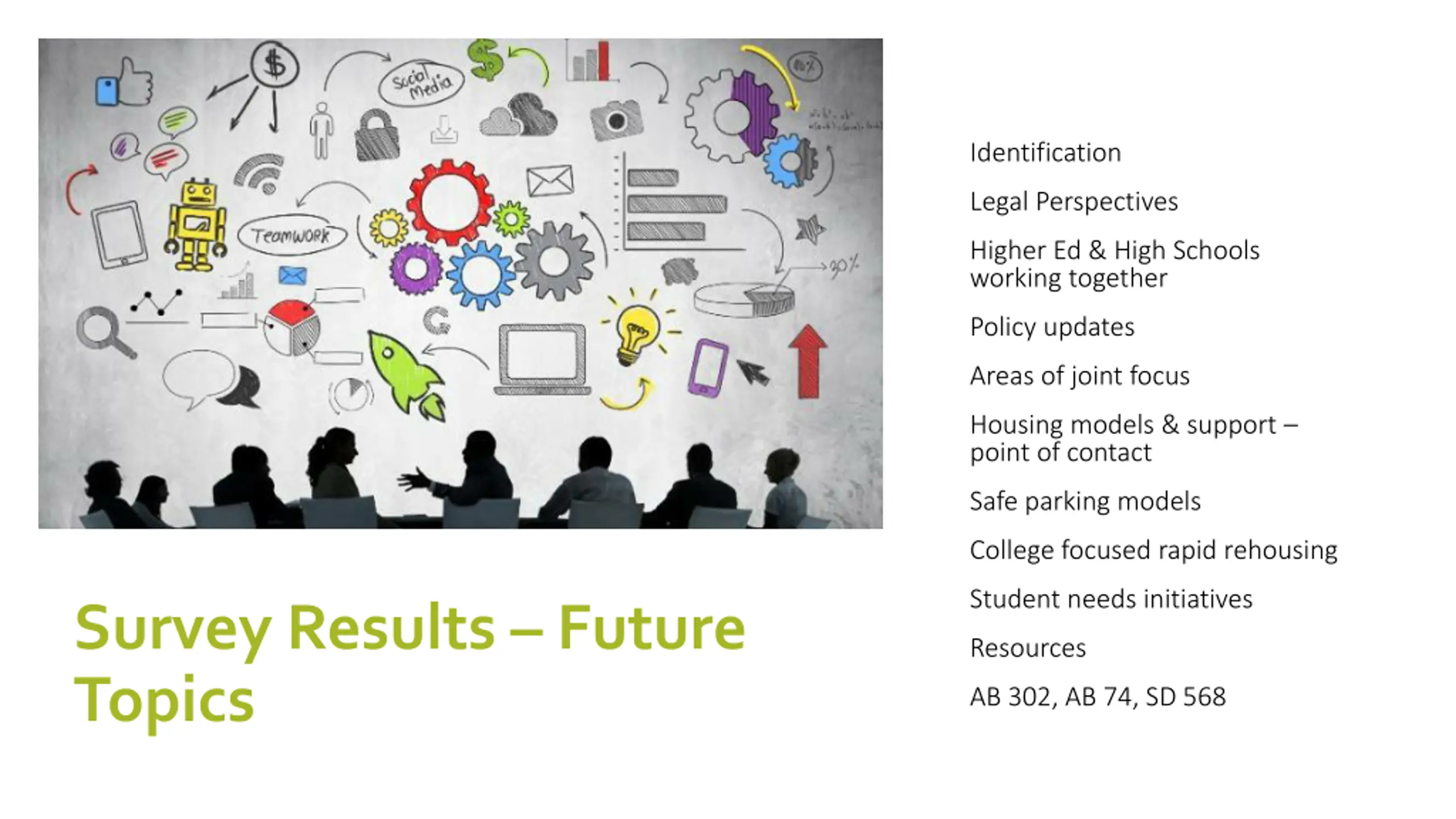 Identification Legal Perspectives Higher Ed & High Schools working together Policy updates Areas of joint focus Housing models & support point of contact Safe parking models College focused rapid rehousing Student needs initiatives Survey Results Future Topics Resources AB 302, AB 74, SD 568