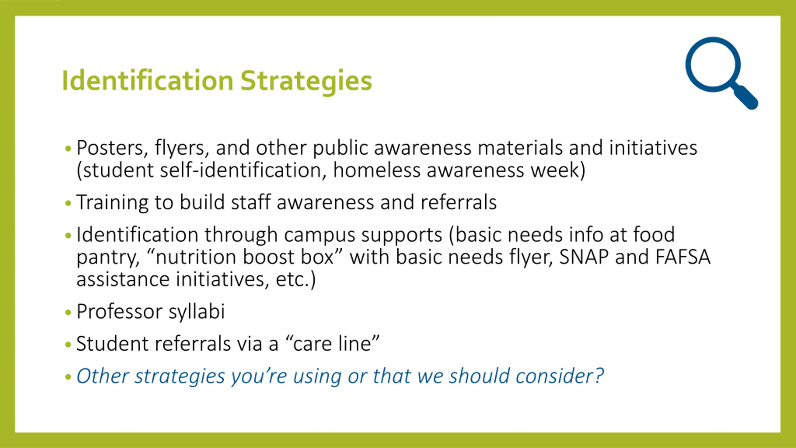 Identification Strategies Posters, flyers, and other public awareness materials and initiatives (student self-identification, homeless awareness week) Training to build staff awareness and referrals Identification through campus supports (basic needs info at food pantry, nutrition boost box with basic needs flyer, SNAP and FAFSA assistance initiatives, etc.) Professor syllabi Student referrals via a care line Other strategies you re using or that we should consider?