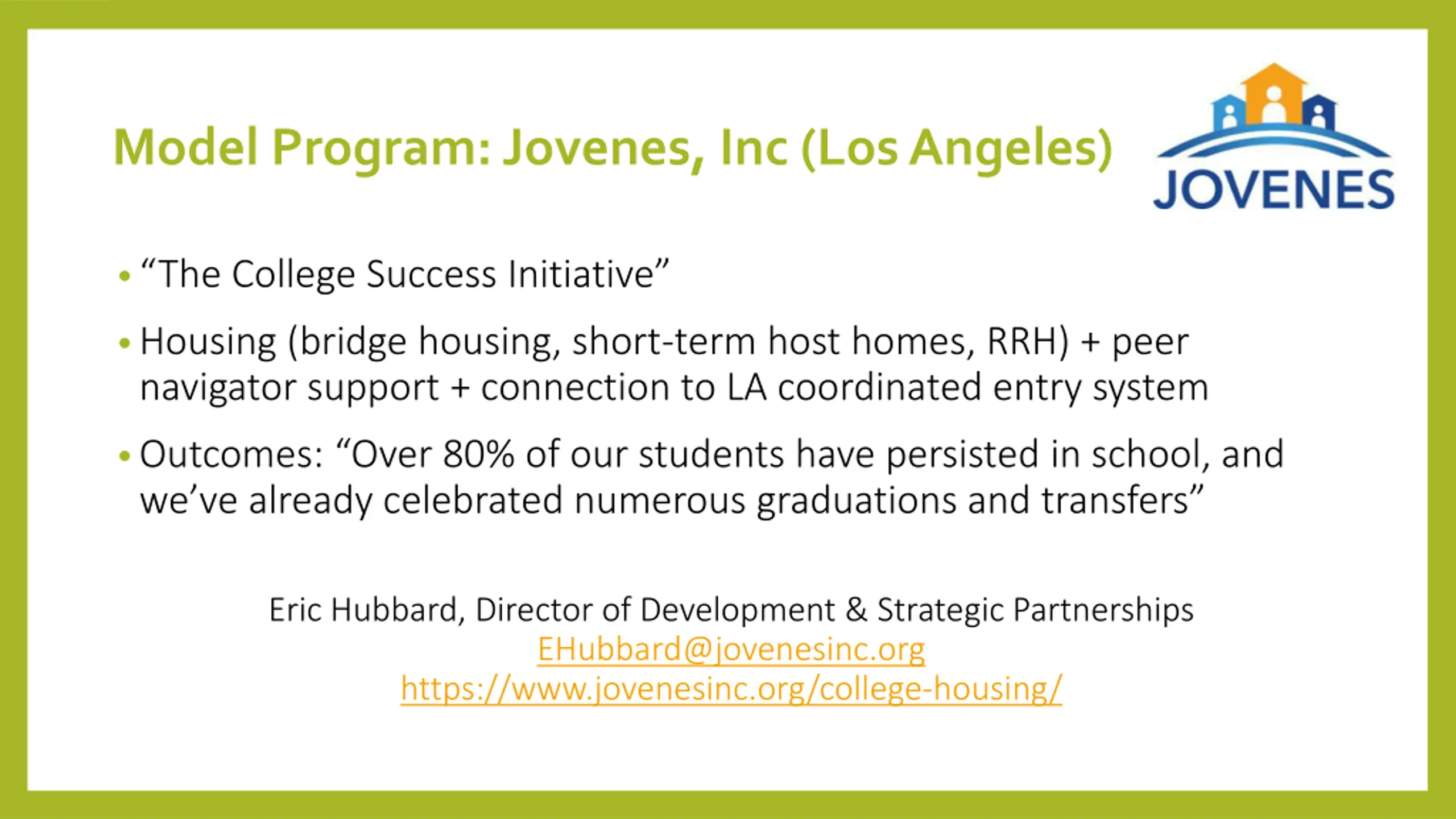 Model Program: Jovenes, Inc (Los Angeles) The College Success Initiative Housing (bridge housing, short-term host homes, RRH) + peer navigator support + connection to LA coordinated entry system Outcomes: Over 80% of our students have persisted in school, and we ve already celebrated numerous graduations and transfers Eric Hubbard, Director of Development & Strategic Partnerships EHubbard@jovenesinc.org https://www.jovenesinc.org/college-housing/
