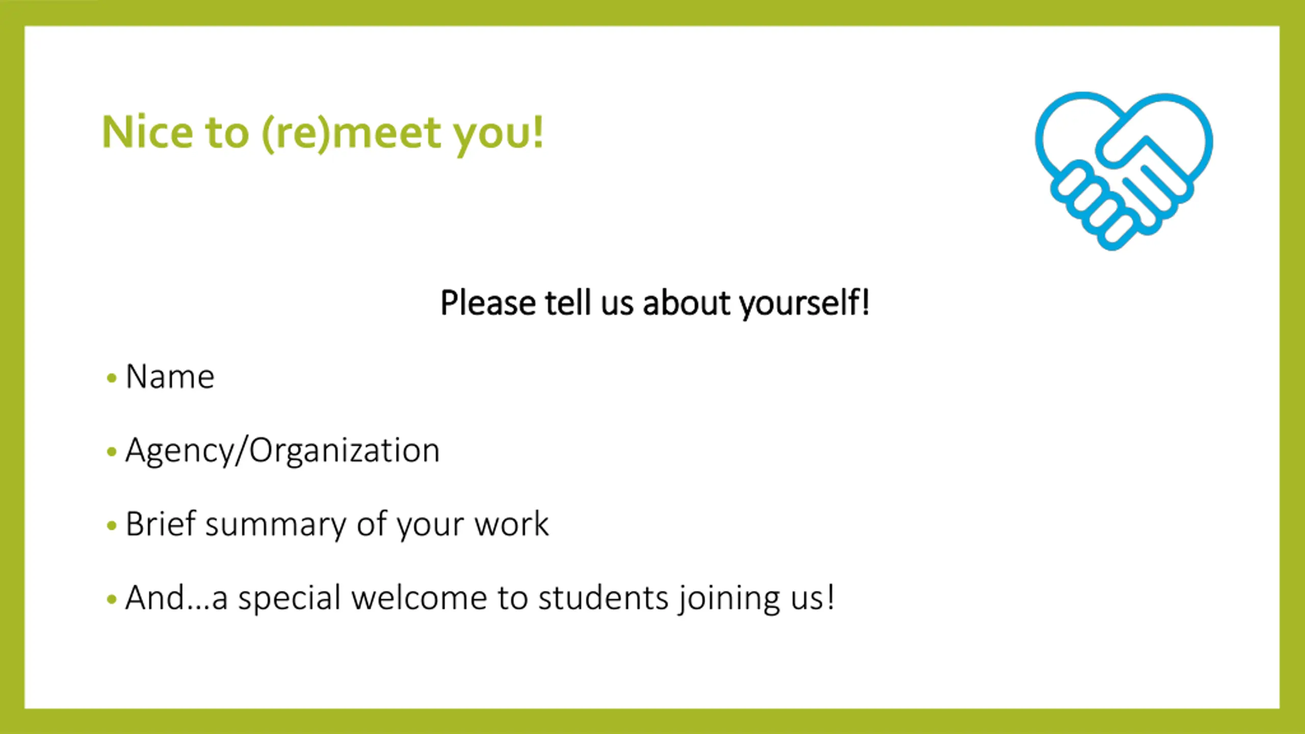 Nice to (re)meet you! Please tell us about yourself! Please tell us about yourself! Name Agency/Organization Brief summary of your work And a special welcome to students joining us!