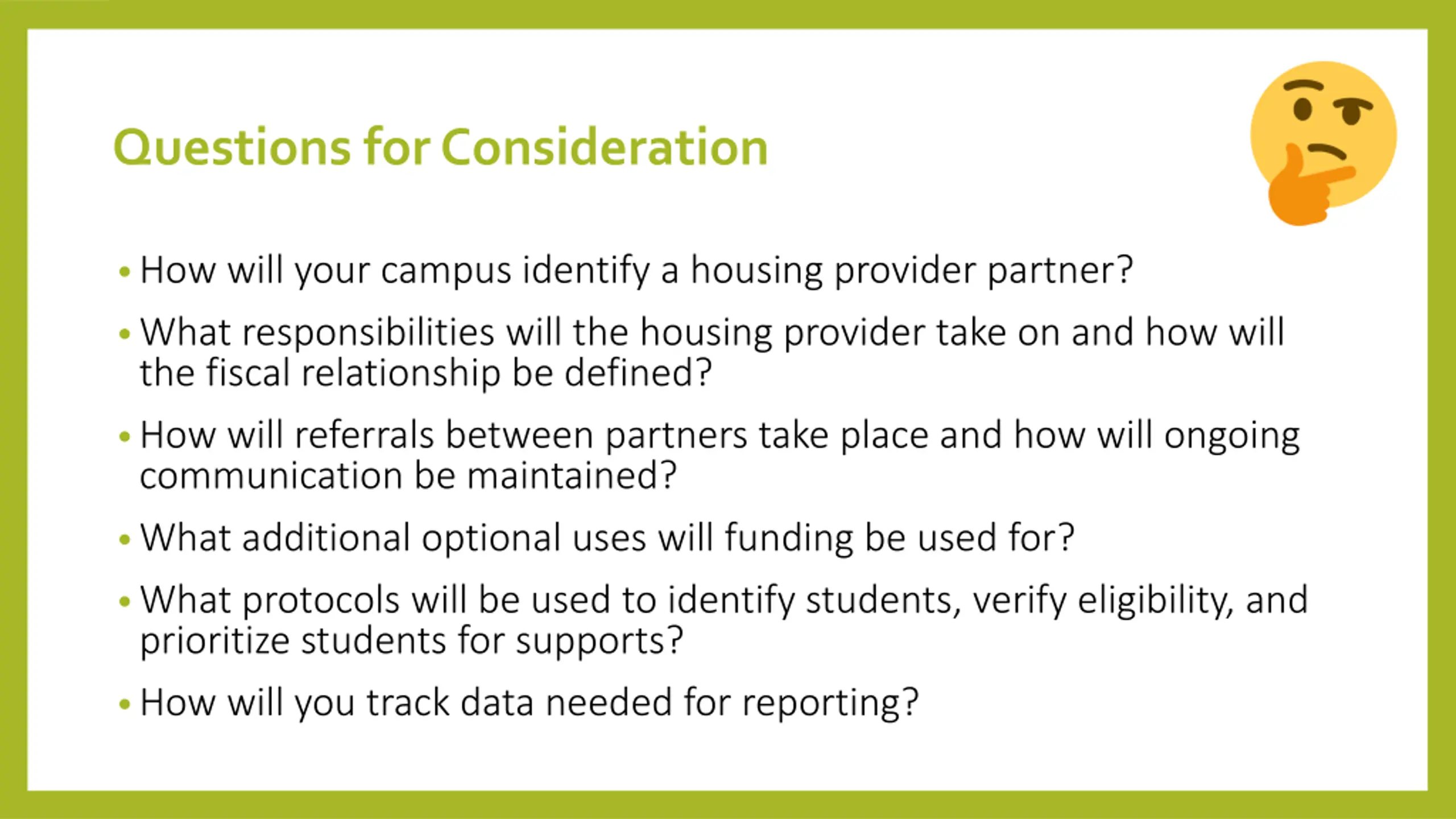 Questions for Consideration How will your campus identify a housing provider partner? What responsibilities will the housing provider take on and how will the fiscal relationship be defined? How will referrals between partners take place and how will ongoing communication be maintained? What additional optional uses will funding be used for? What protocols will be used to identify students, verify eligibility, and prioritize students for supports? How will you track data needed for reporting?