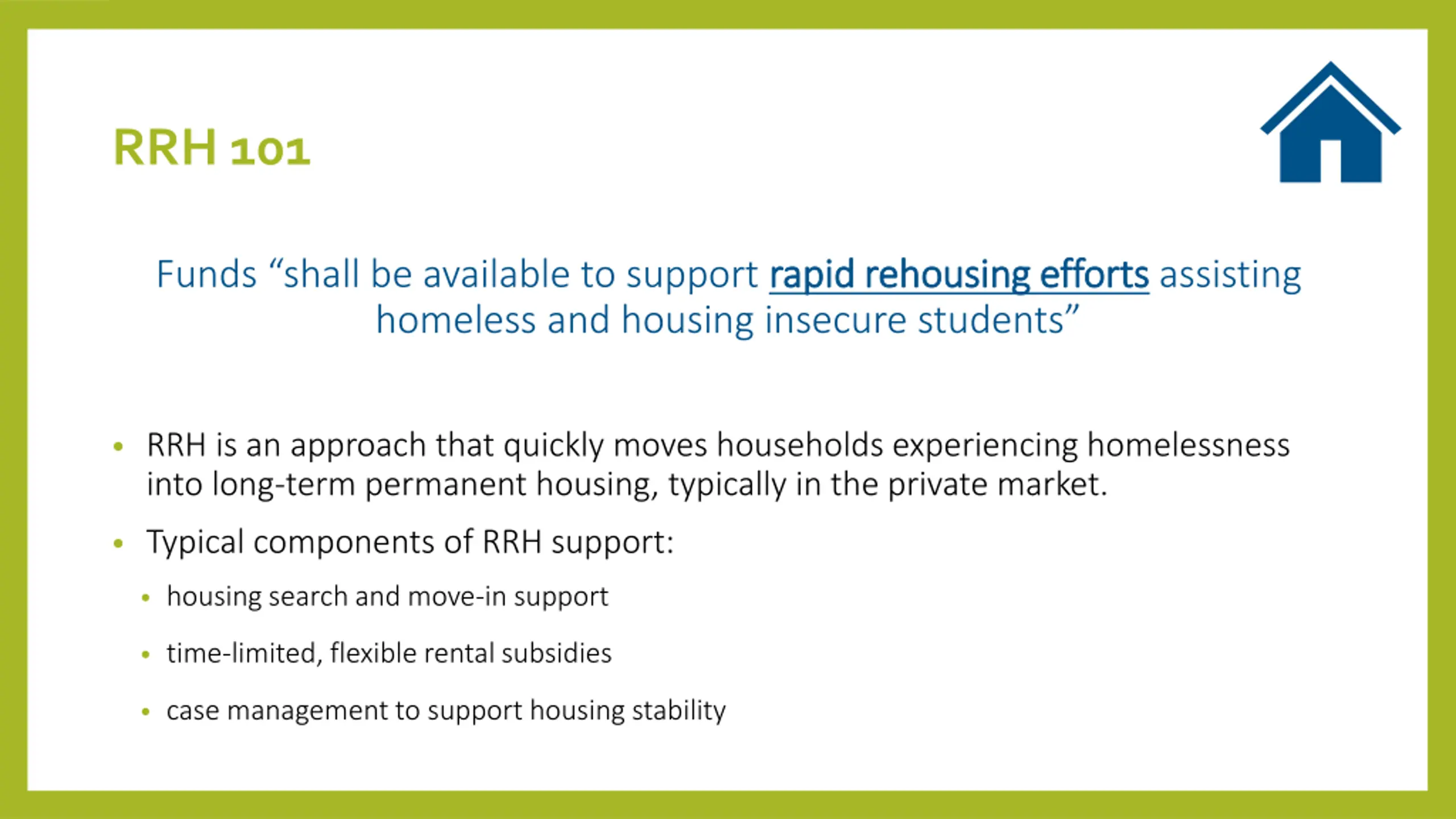 RRH 101 Funds shall be available to support rapid rehousing efforts homeless and housing insecure students rapid rehousing efforts assisting RRH is an approach that quickly moves households experiencing homelessness into long-term permanent housing, typically in the private market. Typical components of RRH support: housing search and move-in support time-limited, flexible rental subsidies case management to support housing stability