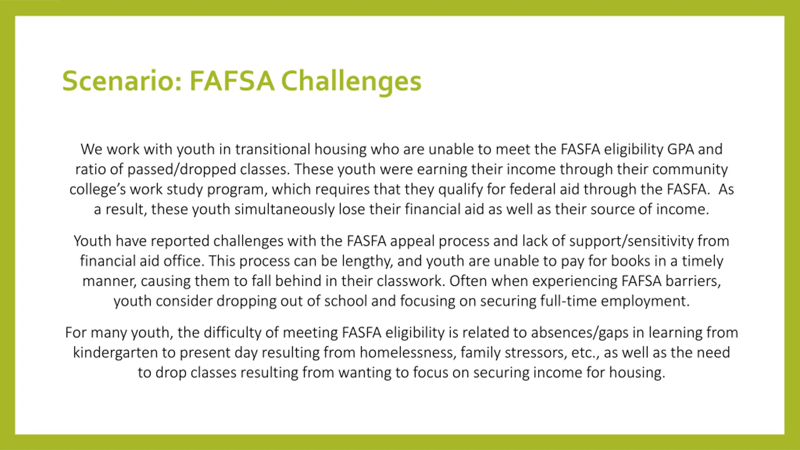 Scenario: FAFSA Challenges We work with youth in transitional housing who are unable to meet the FASFA eligibility GPA and ratio of passed/dropped classes. These youth were earning their income through their community college s work study program, which requires that they qualify for federal aid through the FASFA. As a result, these youth simultaneously lose their financial aid as well as their source of income. Youth have reported challenges with the FASFA appeal process and lack of support/sensitivity from financial aid office. This process can be lengthy, and youth are unable to pay for books in a timely manner, causing them to fall behind in their classwork. Often when experiencing FAFSA barriers, youth consider dropping out of school and focusing on securing full-time employment. For many youth, the difficulty of meeting FASFA eligibility is related to absences/gaps in learning from kindergarten to present day resulting from homelessness, family stressors, etc., as well as the need to drop classes resulting from wanting to focus on securing income for housing.