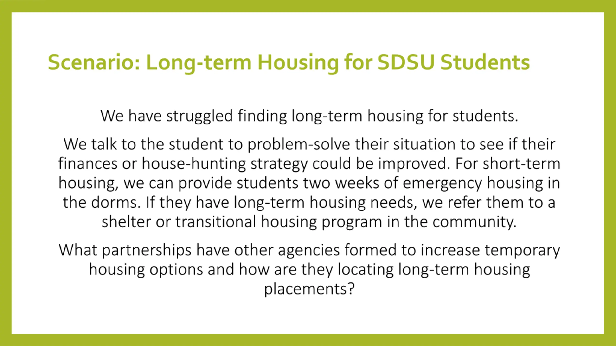 Scenario: Long-term Housing for SDSU Students We have struggled finding long-term housing for students. We talk to the student to problem-solve their situation to see if their finances or house-hunting strategy could be improved. For short-term housing, we can provide students two weeks of emergency housing in the dorms. If they have long-term housing needs, we refer them to a shelter or transitional housing program in the community. What partnerships have other agencies formed to increase temporary housing options and how are they locating long-term housing placements?