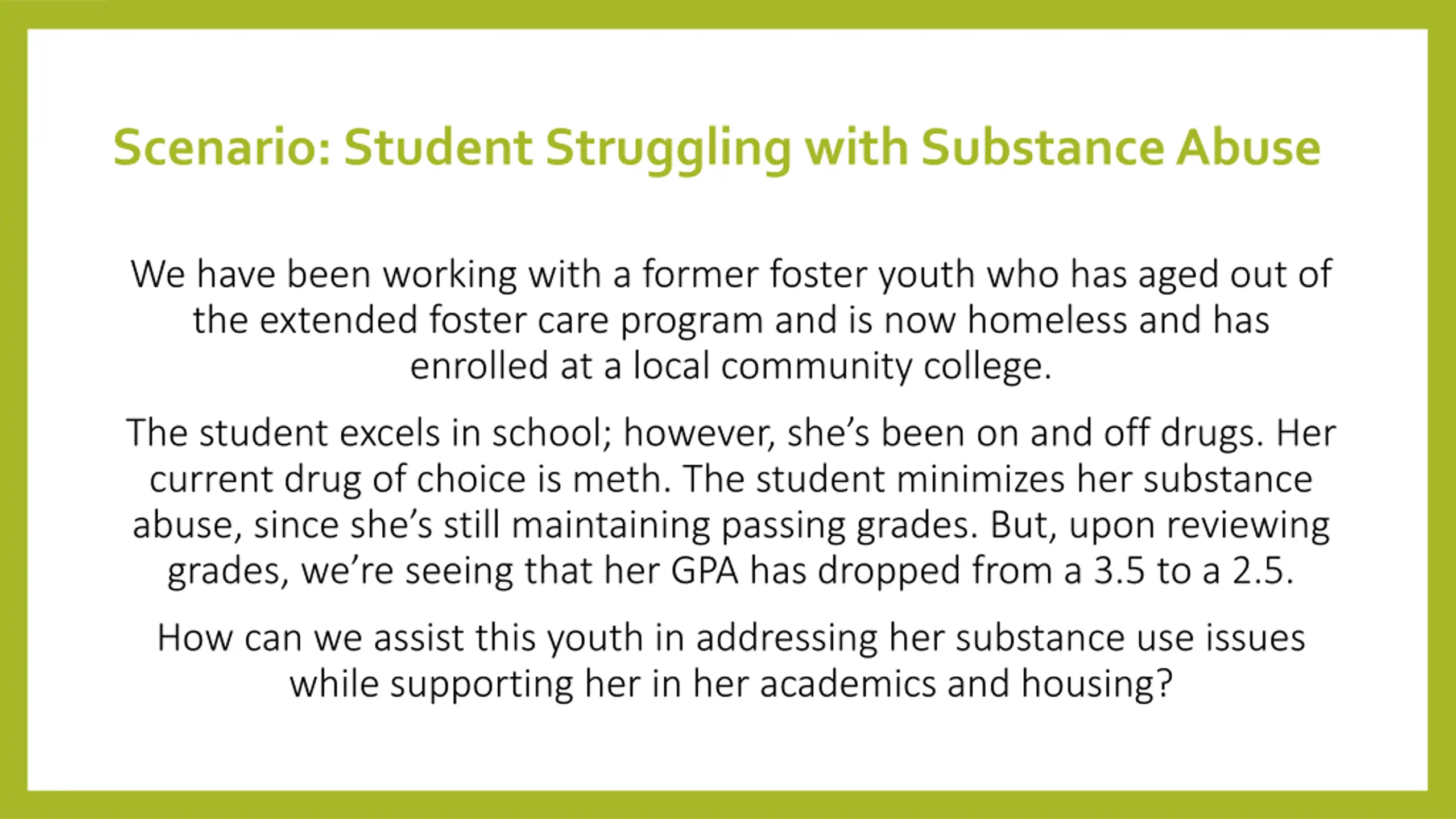 Scenario: Student Struggling with Substance Abuse We have been working with a former foster youth who has aged out of the extended foster care program and is now homeless and has enrolled at a local community college. The student excels in school; however, she s been on and off drugs. Her current drug of choice is meth. The student minimizes her substance abuse, since she s still maintaining passing grades. But, upon reviewing grades, we re seeing that her GPA has dropped from a 3.5 to a 2.5. How can we assist this youth in addressing her substance use issues while supporting her in her academics and housing?
