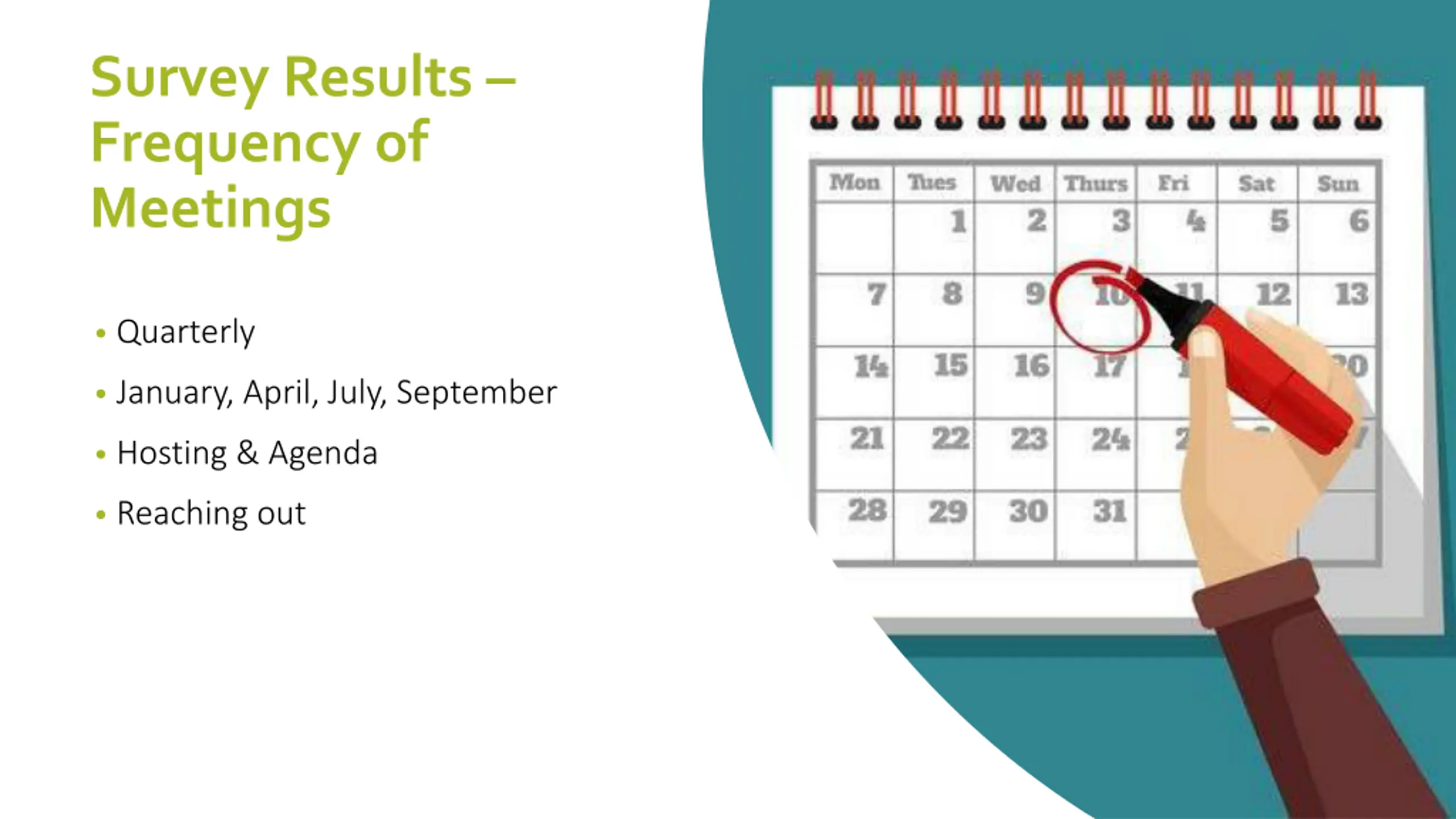 Survey Results Frequency of Meetings Quarterly January, April, July, September Hosting & Agenda Reaching out