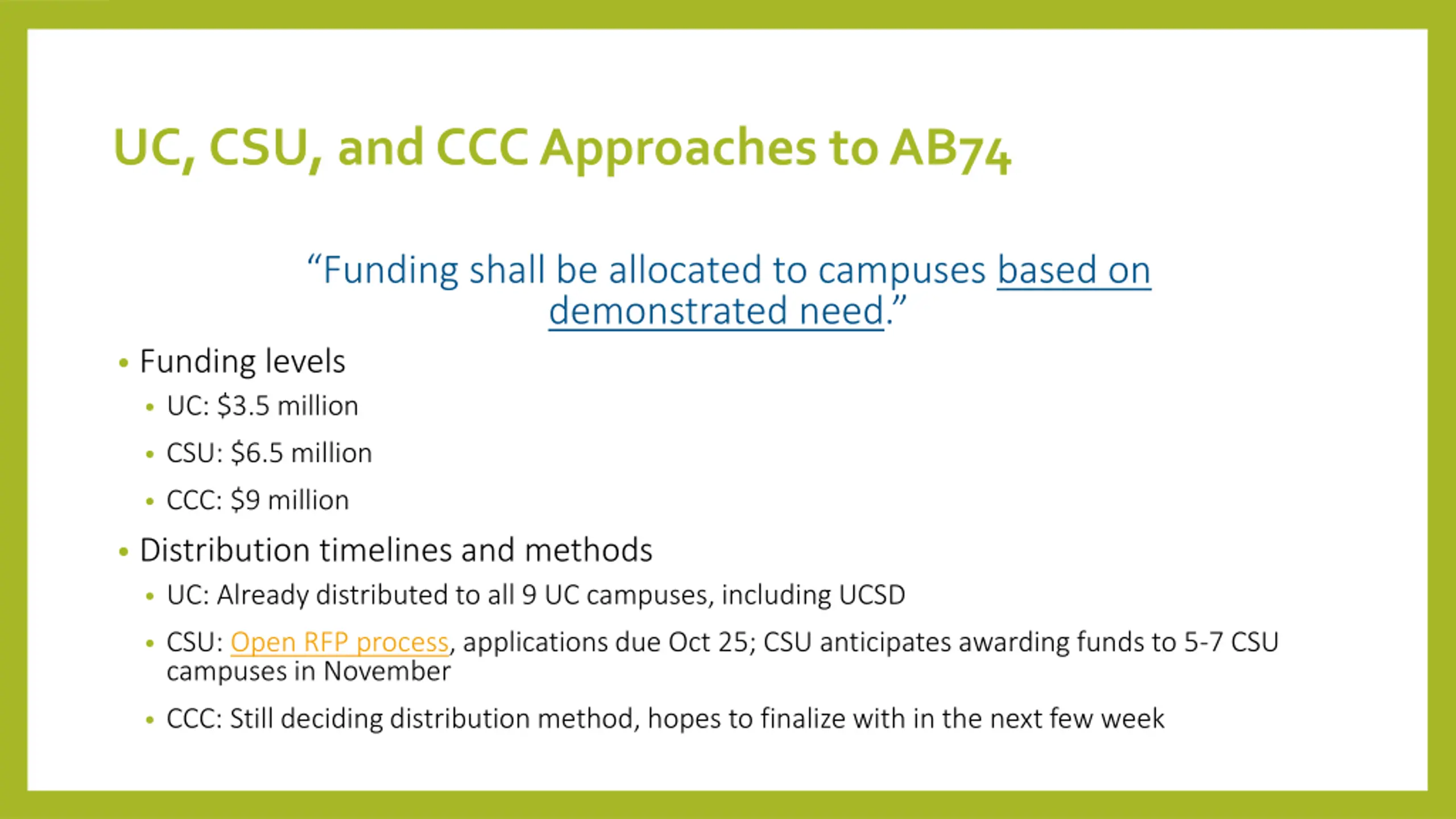 UC, CSU, and CCC Approaches to AB74 Funding shall be allocated to campuses based on demonstrated need. Funding levels UC: $3.5 million CSU: $6.5 million CCC: $9 million Distribution timelines and methods UC: Already distributed to all 9 UC campuses, including UCSD CSU: Open RFP process, applications due Oct 25; CSU anticipates awarding funds to 5-7 CSU campuses in November CCC: Still deciding distribution method, hopes to finalize with in the next few week