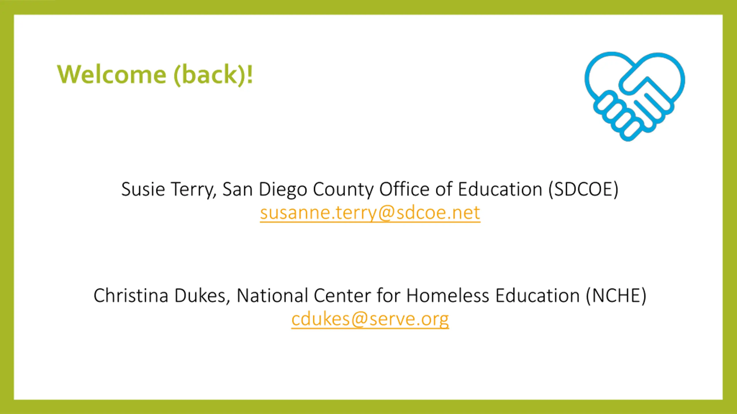 Welcome (back)! Susie Terry, San Diego County Office of Education (SDCOE) susanne.terry@sdcoe.net Christina Dukes, National Center for Homeless Education (NCHE) cdukes@serve.org