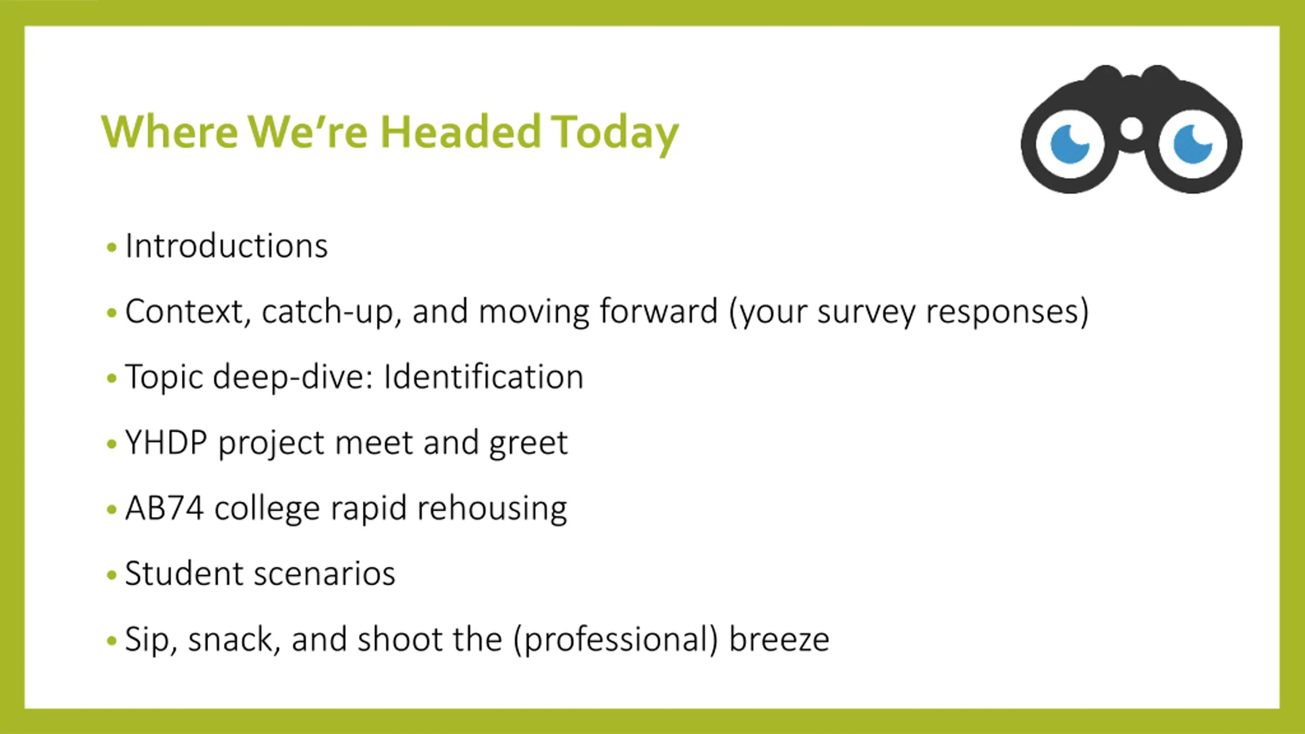 Where Were Headed Today Introductions Context, catch-up, and moving forward (your survey responses) Topic deep-dive: Identification YHDP project meet and greet AB74 college rapid rehousing Student scenarios Sip, snack, and shoot the (professional) breeze