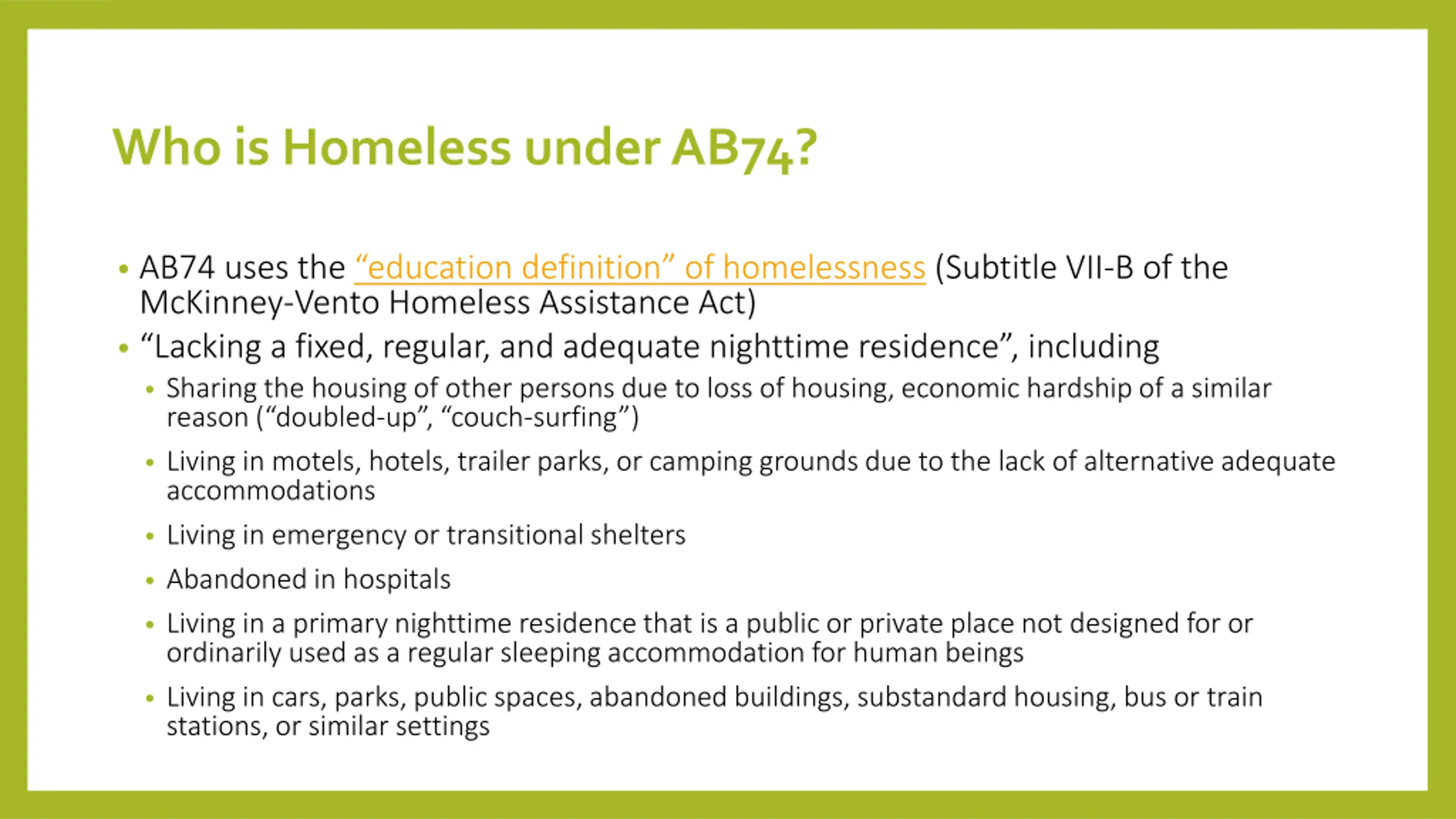 Who is Homeless under AB74? AB74 uses the education definition of homelessness (Subtitle VII-B of the McKinney-Vento Homeless Assistance Act) Lacking a fixed, regular, and adequate nighttime residence , including Sharing the housing of other persons due to loss of housing, economic hardship of a similar reason ( doubled-up , couch-surfing ) Living in motels, hotels, trailer parks, or camping grounds due to the lack of alternative adequate accommodations Living in emergency or transitional shelters Abandoned in hospitals Living in a primary nighttime residence that is a public or private place not designed for or ordinarily used as a regular sleeping accommodation for human beings Living in cars, parks, public spaces, abandoned buildings, substandard housing, bus or train stations, or similar settings
