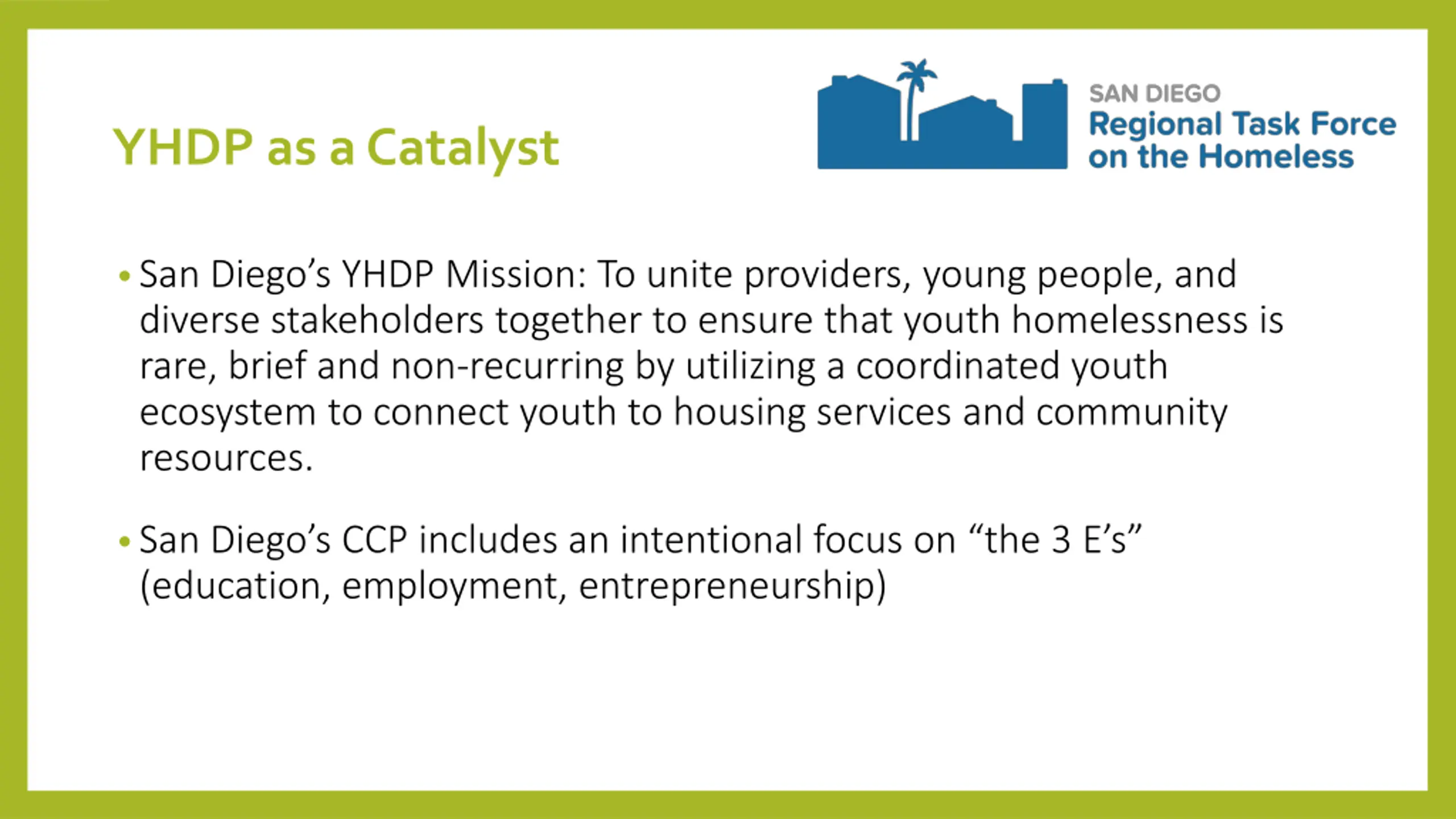 YHDP as a Catalyst San Diego s YHDP Mission: To unite providers, young people, and diverse stakeholders together to ensure that youth homelessness is rare, brief and non-recurring by utilizing a coordinated youth ecosystem to connect youth to housing services and community resources. San Diego s CCP includes an intentional focus on the 3 E s (education, employment, entrepreneurship)