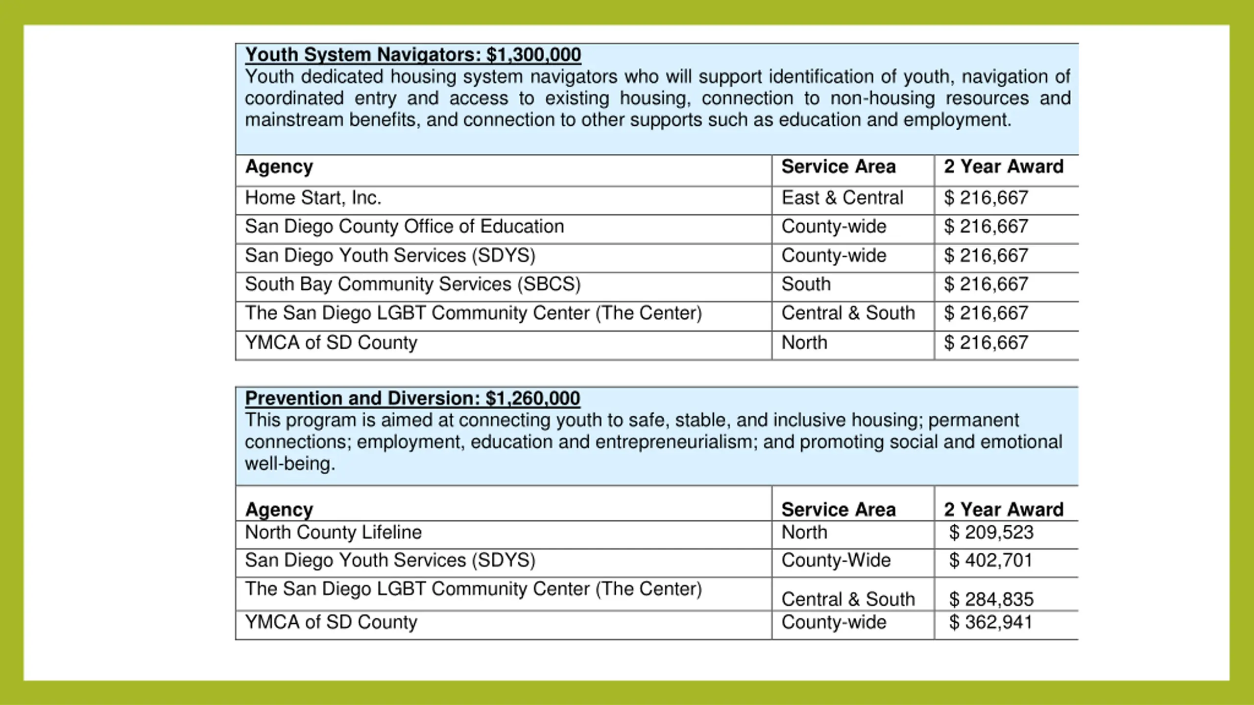 Youth System Navigators: $1,300,000 Youth dedicated housing system navigators who will support identification of youth, navigation of coordinated entry and access to existing housing, connection to non-housing resources and mainstream benefits, and connection to other supports such as education and employment. Agency Home Start, Inc. San Diego County Office of Education San Diego Youth Services (SDYS) South Bay Community Services (SBCS) The San Diego LGBT Community Center (The Center) YMCA of SD County Service Area East & Central County-wide County-wide South Central & South North 2 Year Award $ 216,667 $ 216,667 $ 216,667 $ 216,667 $ 216,667 $ 216,667 Prevention and Diversion: $1,260,000 This program is aimed at connecting youth to safe, stable, and inclusive housing; permanent connections; employment, education and entrepreneurialism; and promoting social and emotional well-being. Agency North County Lifeline San Diego Youth Services (SDYS) The San Diego LGBT Community Center (The Center) Service Area North County-Wide 2 Year Award $ 209,523 $ 402,701 Central & South County-wide $ 284,835 $ 362,941 YMCA of SD County