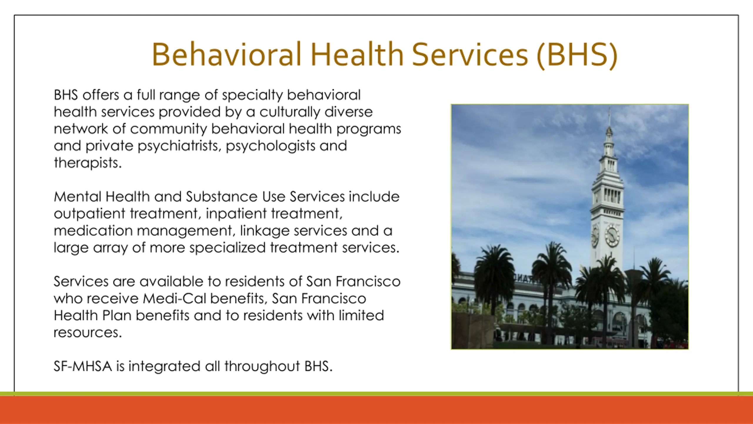 Behavioral Health Services (BHS) BHS offers a full range of specialty behavioral health services provided by a culturally diverse network of community behavioral health programs and private psychiatrists, psychologists and therapists. Mental Health and Substance Use Services include outpatient treatment, inpatient treatment, medication management, linkage services and a large array of more specialized treatment services. Services are available to residents of San Francisco who receive Medi-Cal benefits, San Francisco Health Plan benefits and to residents with limited resources. SF-MHSA is integrated all throughout BHS.