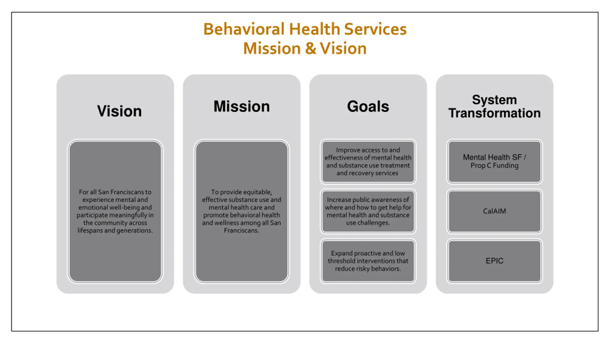 Behavioral Health Services Mission & Vision System Transformation Mission Goals Vision Improve access to and effectiveness of mental health and substance use treatment and recovery services Mental Health SF / Prop C Funding For all San Franciscans to experience mental and emotional well-being and participate meaningfully in the community across lifespans and generations. To provide equitable, effective substance use and mental health care and promote behavioral health and wellness among all San Franciscans. Increase public awareness of where and how to get help for mental health and substance use challenges. CalAIM Expand proactive and low threshold interventions that reduce risky behaviors. EPIC