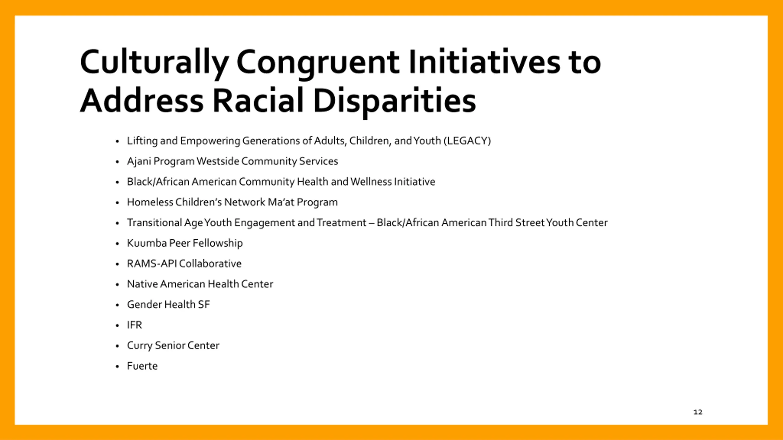 Culturally Congruent Initiatives to Address Racial Disparities Lifting and Empowering Generations of Adults, Children, andYouth (LEGACY) Ajani Program Westside Community Services Black/African American Community Health and Wellness Initiative Homeless Children s Network Ma at Program Transitional Age Youth Engagement and Treatment Black/African American Third Street Youth Center Kuumba Peer Fellowship RAMS-API Collaborative Native American Health Center Gender Health SF IFR Curry Senior Center Fuerte 12