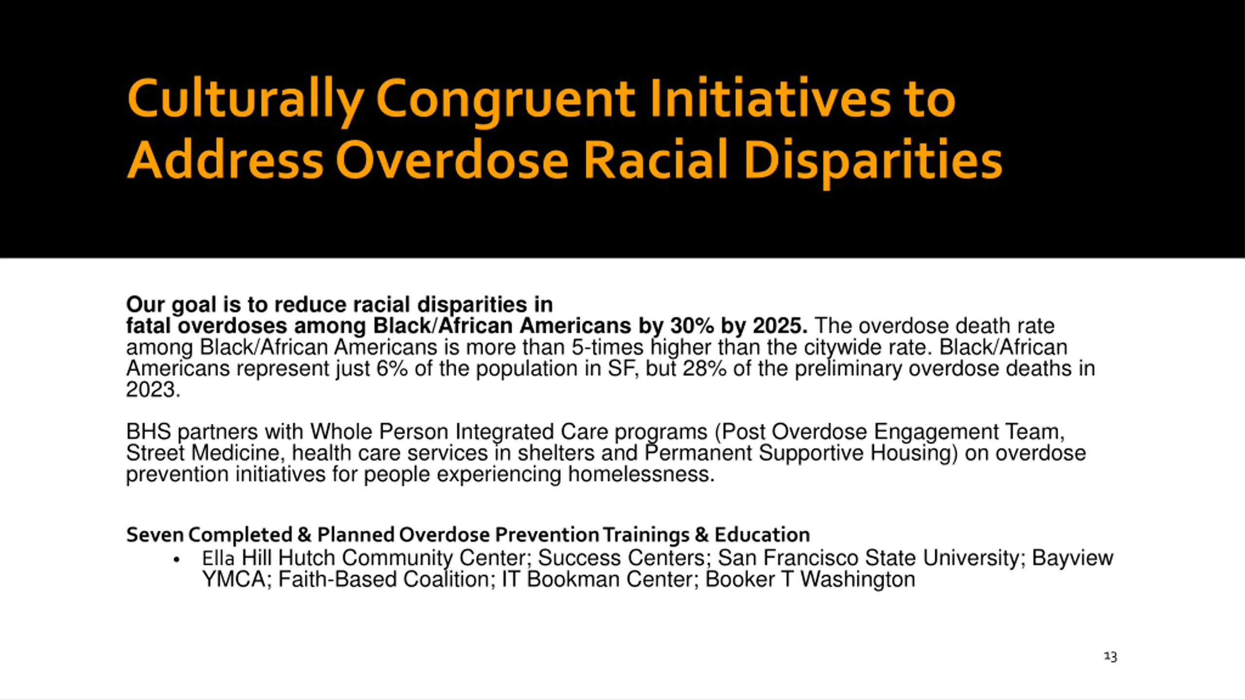 Culturally Congruent Initiatives to Address Overdose Racial Disparities Our goal is to reduce racial disparities in fatal overdoses among Black/African Americans by 30% by 2025. The overdose death rate among Black/African Americans is more than 5-times higher than the citywide rate. Black/African Americans represent just 6% of the population in SF, but 28% of the preliminary overdose deaths in 2023. BHS partners with Whole Person Integrated Care programs (Post Overdose Engagement Team, Street Medicine, health care services in shelters and Permanent Supportive Housing) on overdose prevention initiatives for people experiencing homelessness. Seven Completed & Planned Overdose Prevention Trainings & Education Ella Hill Hutch Community Center; Success Centers; San Francisco State University; Bayview YMCA; Faith-Based Coalition; IT Bookman Center; Booker T Washington 13