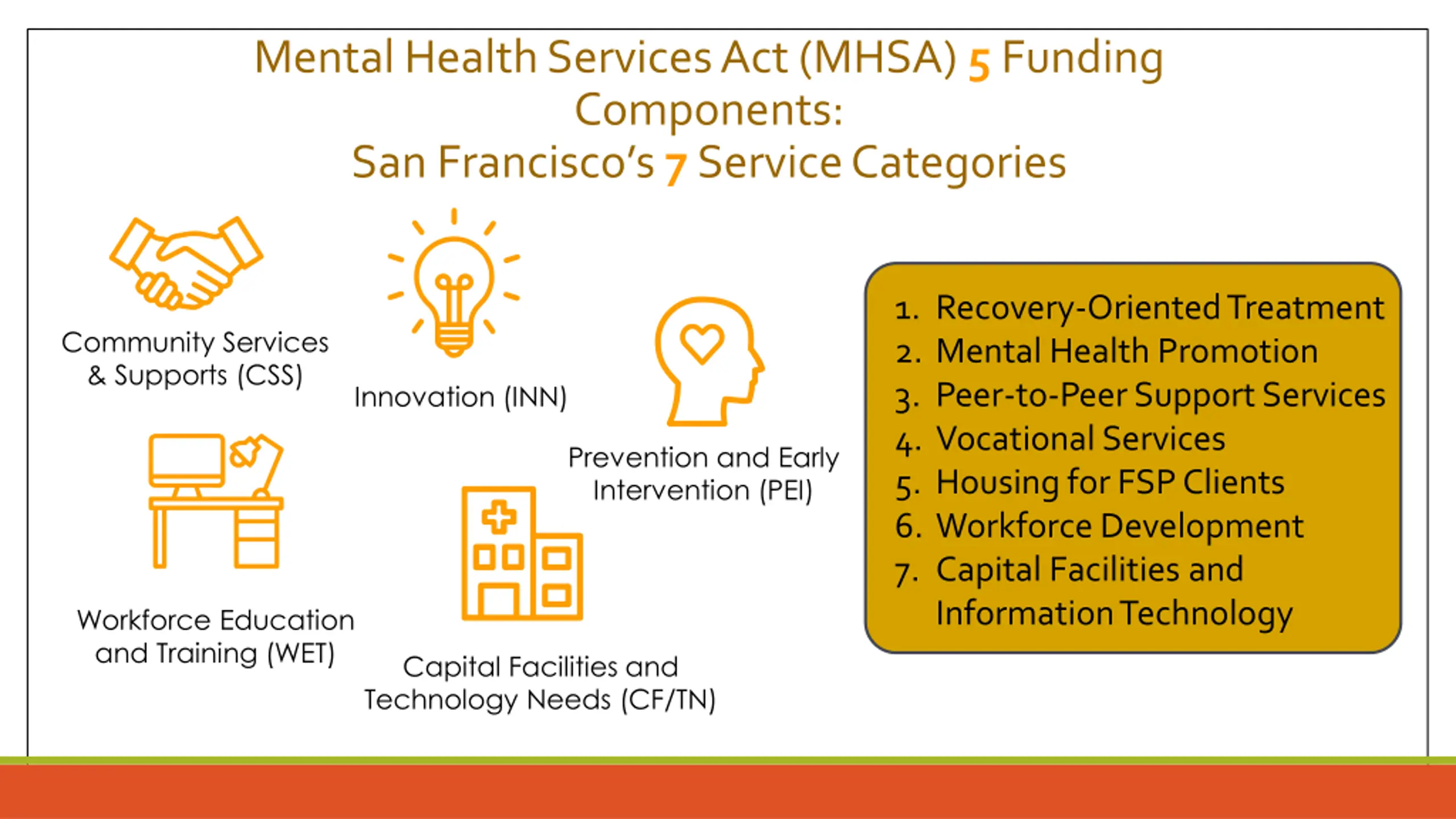 Mental Health Services Act (MHSA) 5 Funding Components: San Francisco s7 Service Categories 1. Recovery-Oriented Treatment 2. Mental Health Promotion 3. Peer-to-Peer Support Services 4. Vocational Services 5. Housing for FSP Clients 6. Workforce Development 7. Capital Facilities and Information Technology Community Services & Supports (CSS) Innovation (INN) Prevention and Early Intervention (PEI) Workforce Education and Training (WET) Capital Facilities and Technology Needs (CF/TN)