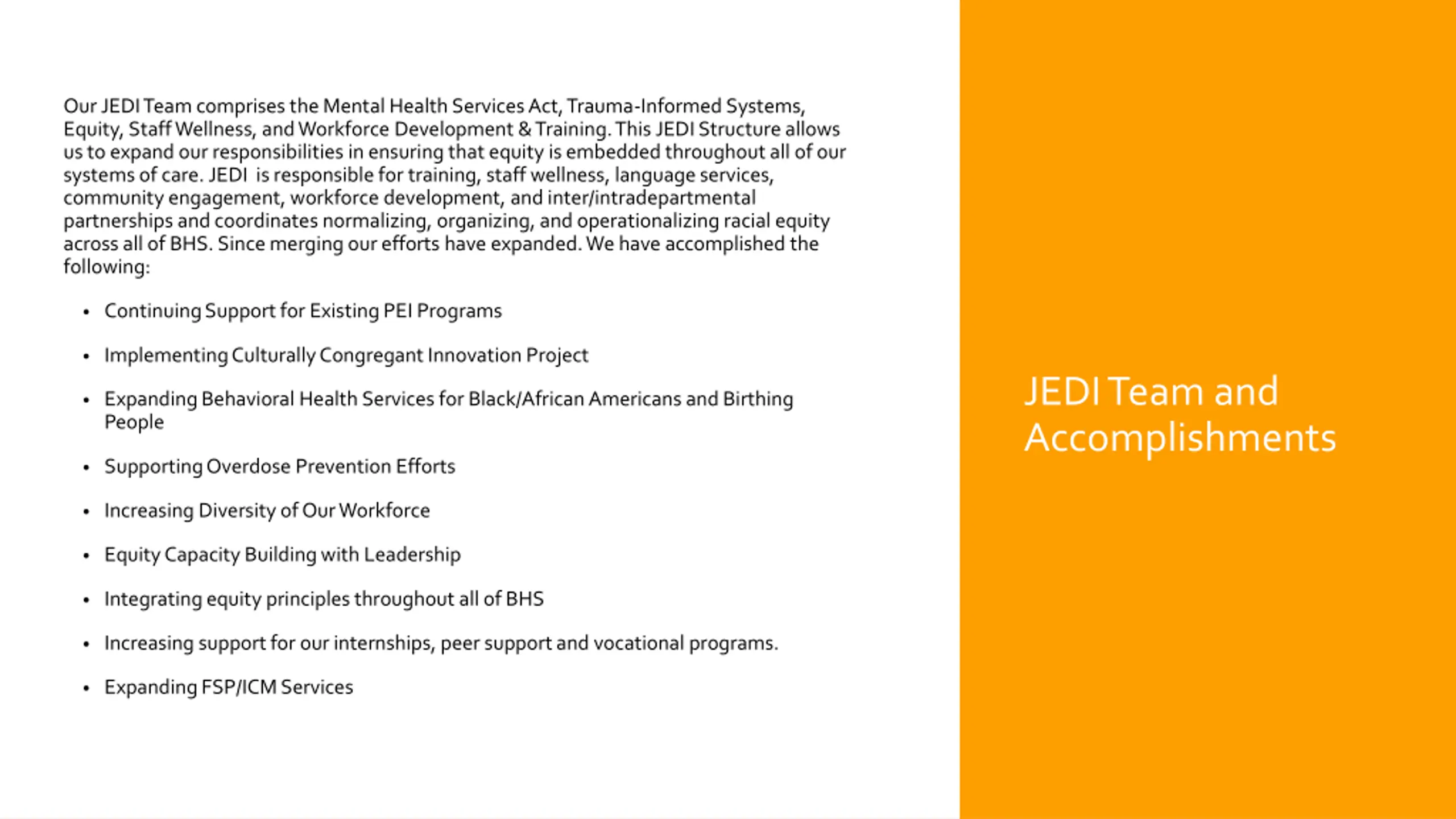 OurJEDITeam comprises the Mental Health Services Act, Trauma-InformedSystems, Equity, Staff Wellness, and Workforce Development & Training. ThisJEDIStructure allows us to expand our responsibilitiesin ensuring that equity is embeddedthroughout all of our systems of care.JEDI is responsible for training, staff wellness, language services, community engagement, workforce development, and inter/intradepartmental partnershipsandcoordinates normalizing,organizing, and operationalizing racial equity across all of BHS.Since merging our efforts have expanded. We have accomplished the following: Continuing Support for Existing PEI Programs Implementing Culturally Congregant Innovation Project JEDI Team and Accomplishments Expanding Behavioral Health Services for Black/African Americans and Birthing People Supporting Overdose Prevention Efforts Increasing Diversity of Our Workforce Equity Capacity Building with Leadership Integrating equity principles throughout all of BHS Increasing support for our internships, peer support and vocational programs. Expanding FSP/ICM Services