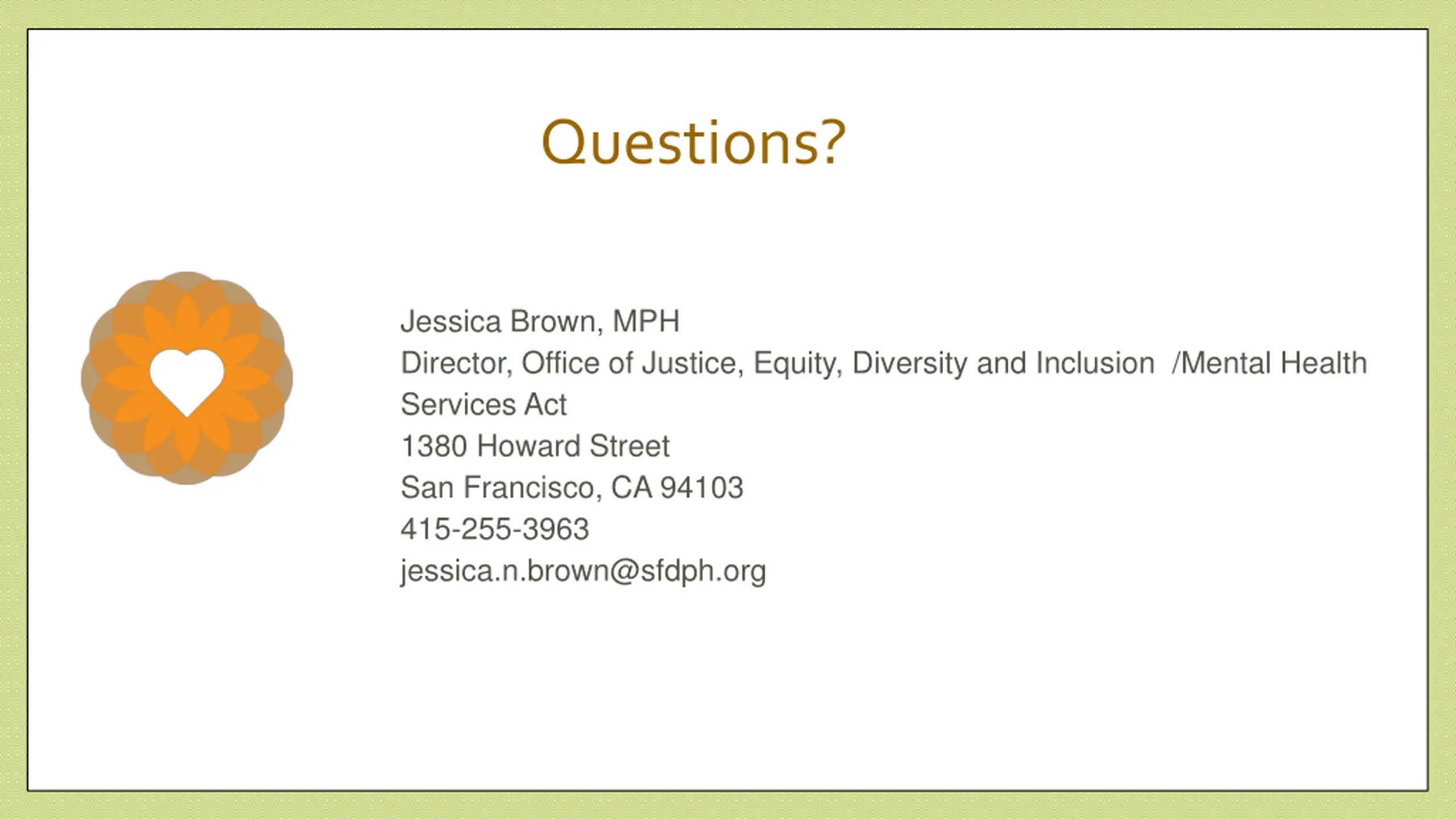 Questions? Jessica Brown, MPH Director, Office of Justice, Equity, Diversity and Inclusion /Mental Health Services Act 1380 Howard Street San Francisco, CA 94103 415-255-3963 jessica.n.brown@sfdph.org