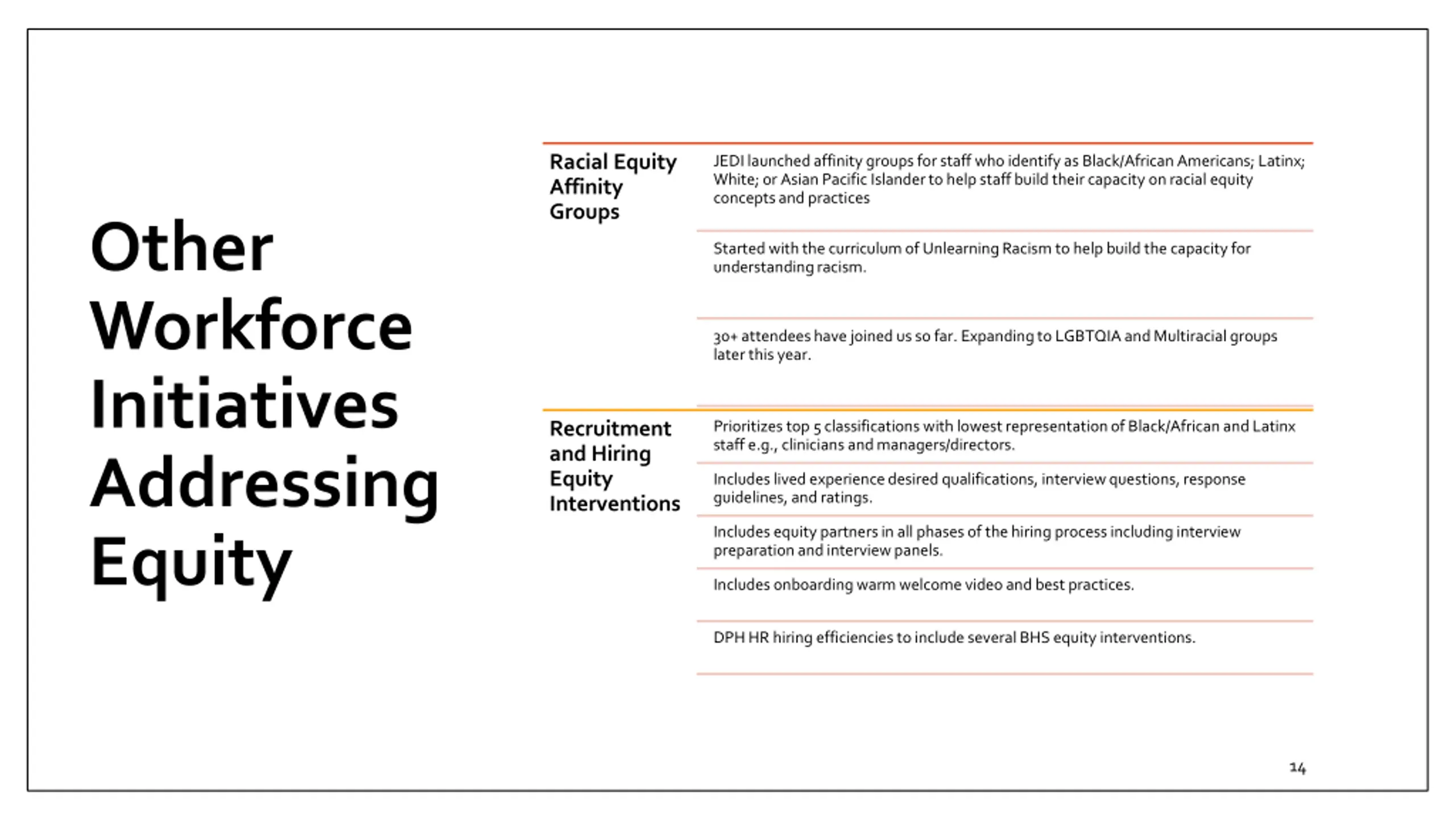 Racial Equity Affinity Groups JEDI launched affinity groups for staff who identify as Black/African Americans; Latinx; White; or Asian Pacific Islander to help staff build their capacity on racial equity concepts andpractices Other Workforce Initiatives Addressing Equity Started with the curriculum of Unlearning Racism to help build the capacity for understandingracism. 30+ attendees have joined us so far. Expanding to LGBTQIA and Multiracial groups later this year. Recruitment and Hiring Equity Interventions Prioritizes top 5 classifications with lowest representation of Black/African and Latinx staff e.g., clinicians andmanagers/directors. Includeslived experience desired qualifications, interview questions, response guidelines,and ratings. Includesequitypartners in all phases of the hiring process including interview preparation and interview panels. Includesonboarding warm welcome video and best practices. DPH HR hiringefficiencies to include several BHS equity interventions. 14