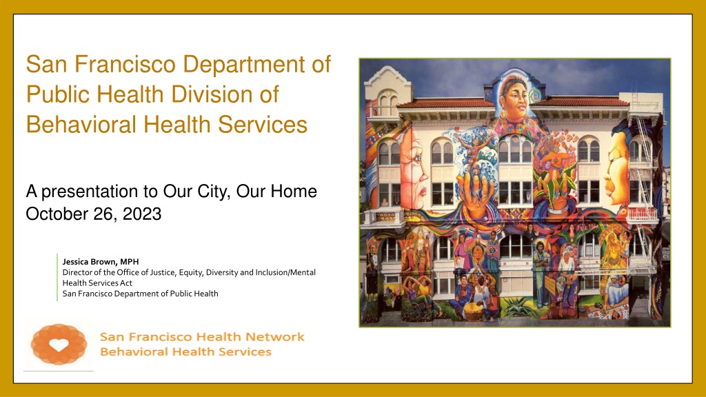 San Francisco Department of Public Health Division of Behavioral Health Services A presentation to Our City, Our Home October 26, 2023 Jessica Brown, MPH Director of the Office of Justice, Equity, Diversity and Inclusion/Mental Health Services Act San Francisco Department of Public Health