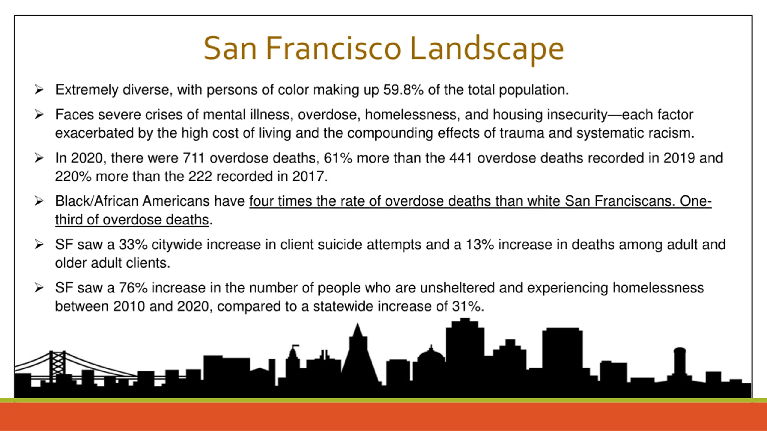 San Francisco Landscape Extremely diverse, with persons of color making up 59.8% of the total population. Faces severe crises of mental illness, overdose, homelessness, and housing insecurity each factor exacerbated by the high cost of living and the compounding effects of trauma and systematic racism. In 2020, there were 711 overdose deaths, 61% more than the 441 overdose deaths recorded in 2019 and 220% more than the 222 recorded in 2017. Black/African Americans have four times the rate of overdose deaths than white San Franciscans. One- third of overdose deaths. SF saw a 33% citywide increase in client suicide attempts and a 13% increase in deaths among adult and older adult clients. SF saw a 76% increase in the number of people who are unsheltered and experiencing homelessness between 2010 and 2020, compared to a statewide increase of 31%. ng people who are unhoused