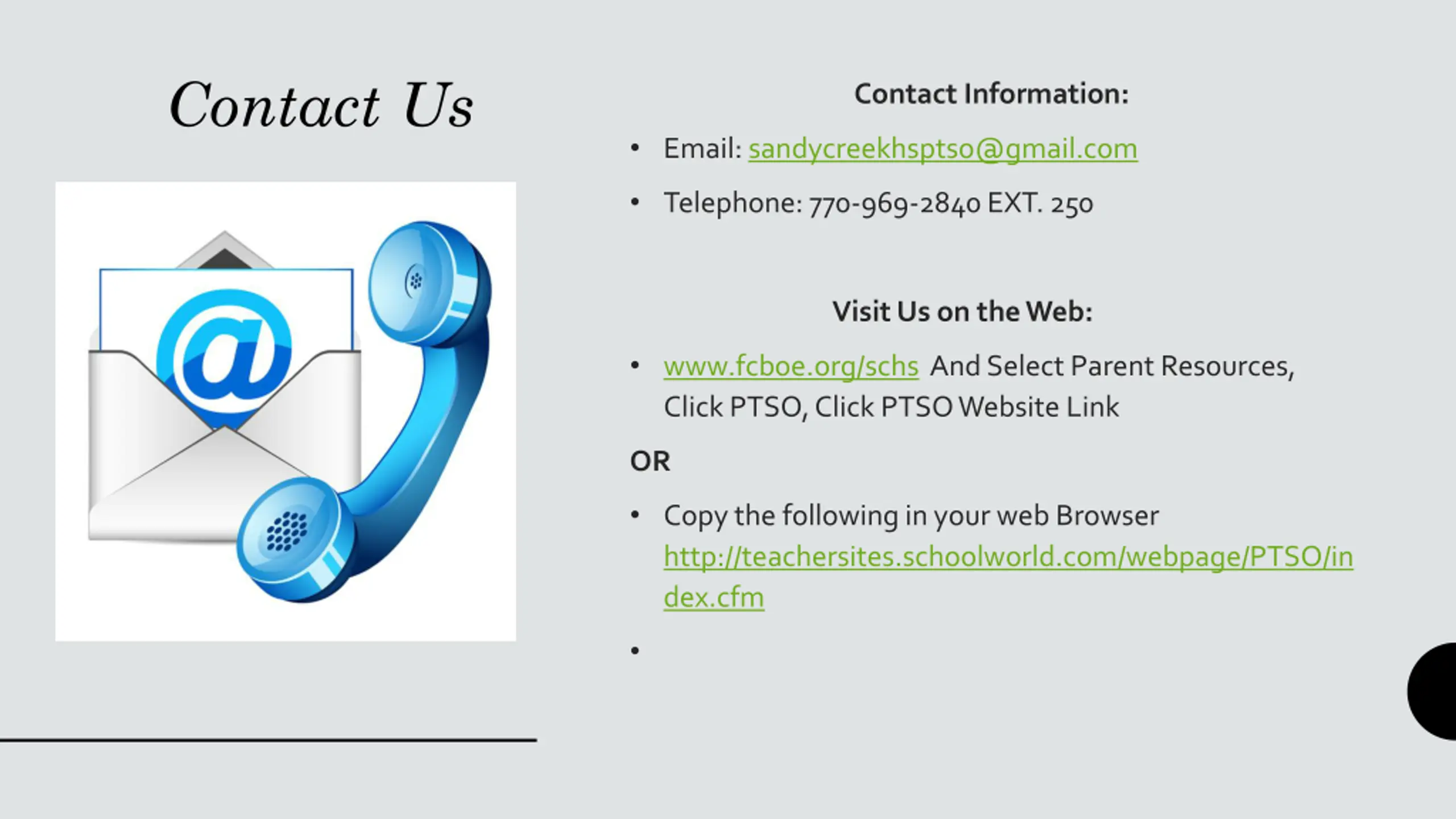 Contact Us Contact Information: Email: sandycreekhsptso@gmail.com Telephone: 770-969-2840 EXT. 250 Visit Us on the Web: www.fcboe.org/schs And Select Parent Resources, Click PTSO, Click PTSO Website Link OR Copy the following in your web Browser http://teachersites.schoolworld.com/webpage/PTSO/in dex.cfm