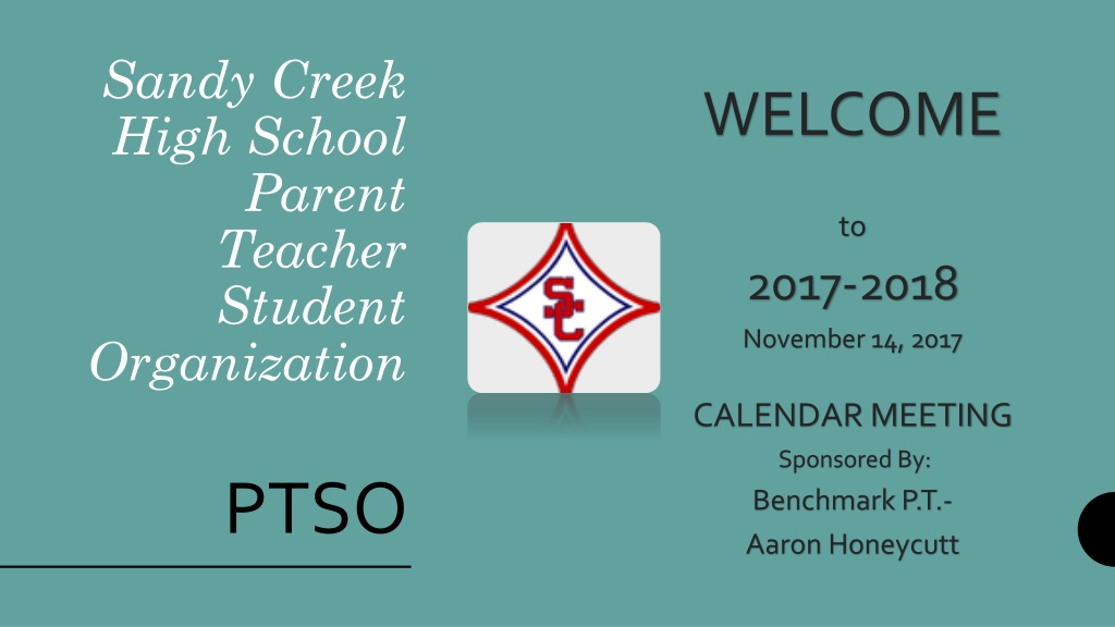Sandy Creek High School Parent Teacher Student Organization WELCOME to 2017-2018 November 14, 2017 CALENDAR MEETING Sponsored By: Benchmark P.T.- Aaron Honeycutt PTSO