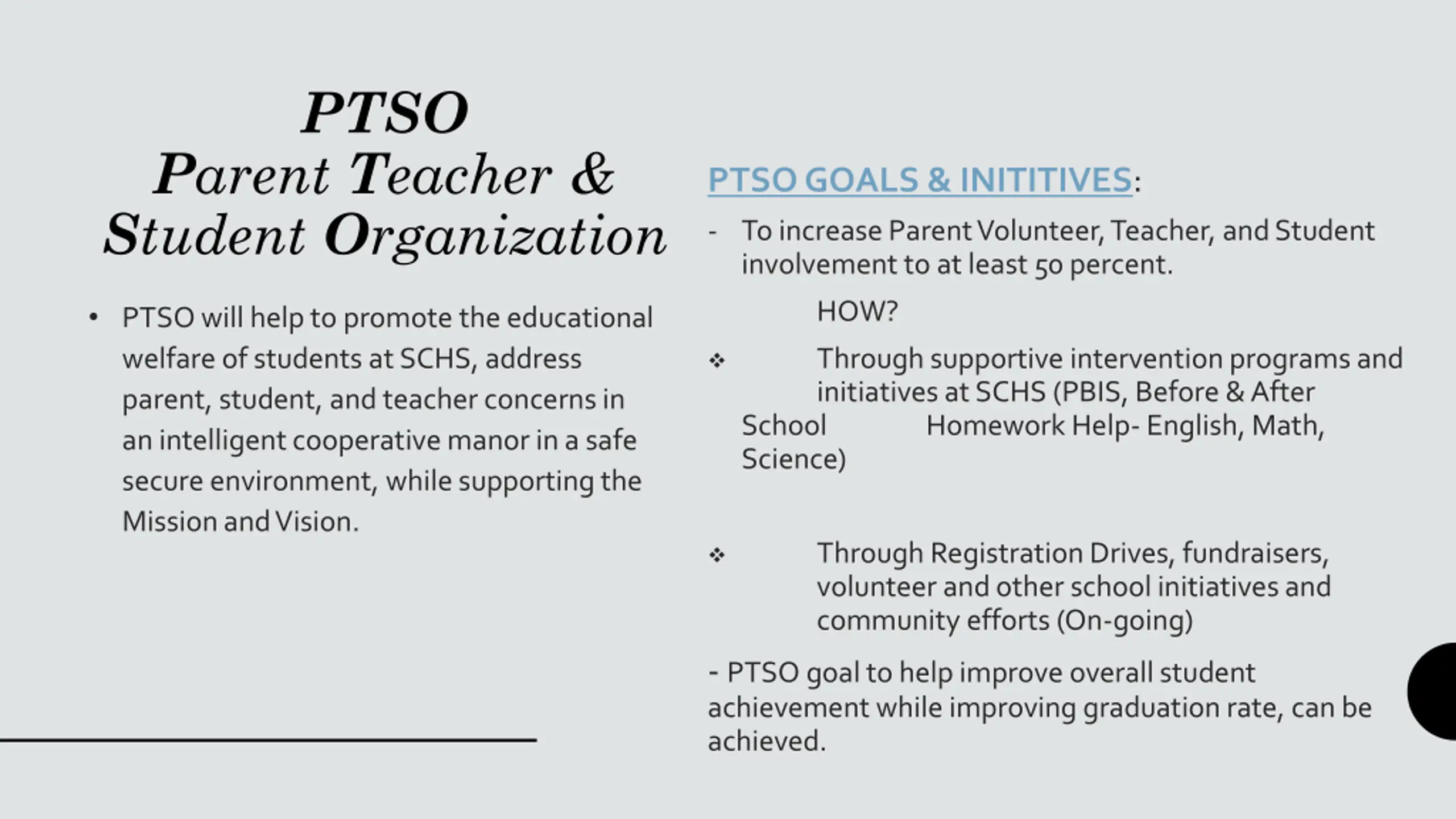 PTSO Parent Teacher & Student Organization PTSO GOALS & INITITIVES: - To increase Parent Volunteer, Teacher, and Student involvement to at least 50 percent. HOW? PTSO will help to promote the educational welfare of students at SCHS, address parent, student, and teacher concerns in an intelligent cooperative manor in a safe secure environment, while supporting the Mission and Vision. Through supportive intervention programs and initiatives at SCHS (PBIS, Before & After School Homework Help- English, Math, Science) Through Registration Drives, fundraisers, volunteer and other school initiatives and community efforts (On-going) - PTSO goal to help improve overall student achievement while improving graduation rate, can be achieved.