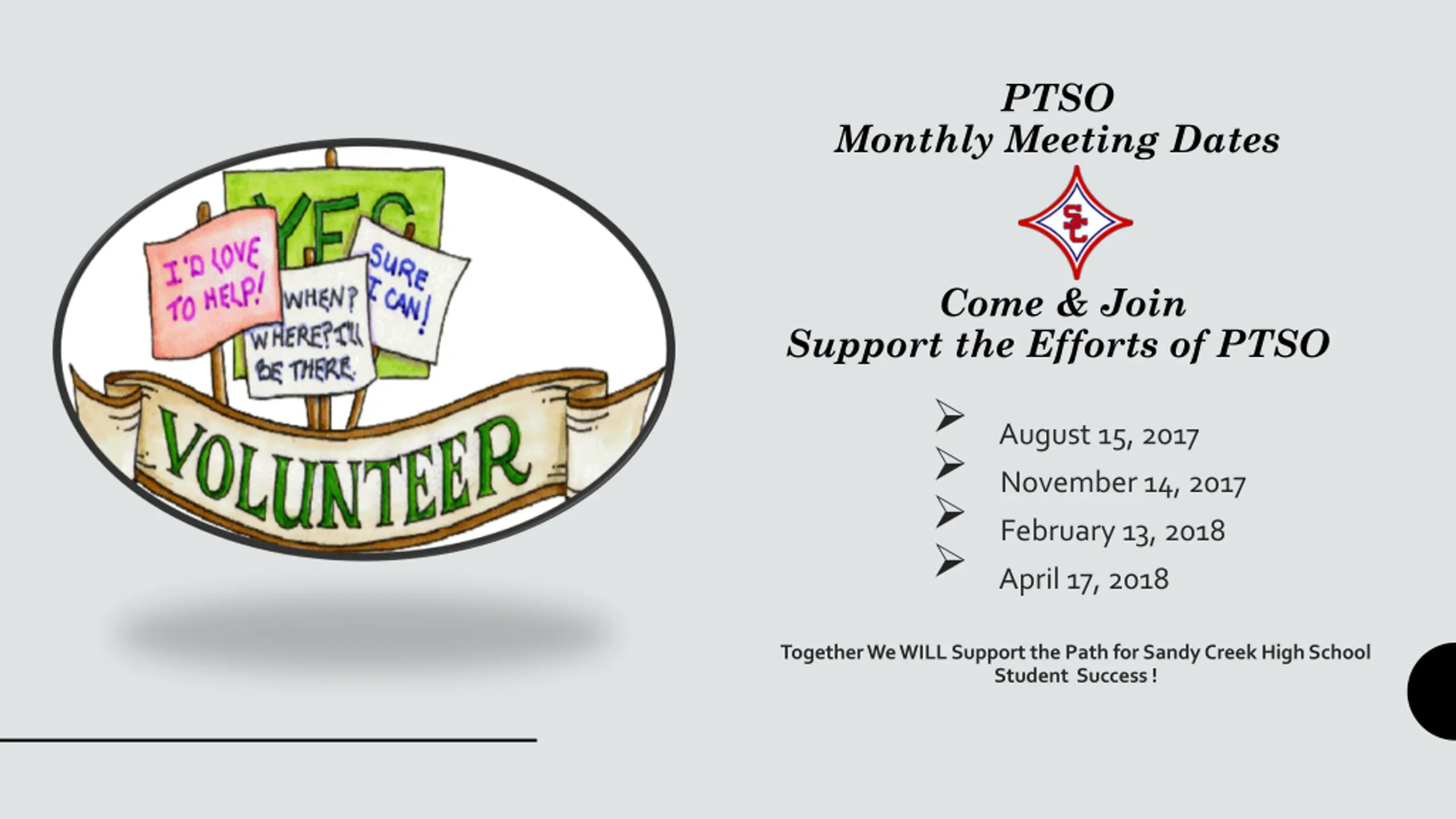 PTSO Monthly Meeting Dates Come & Join Support the Efforts of PTSO August 15, 2017 November 14, 2017 February 13, 2018 April 17, 2018 Together We WILL Support the Path for Sandy Creek High School Student Success !