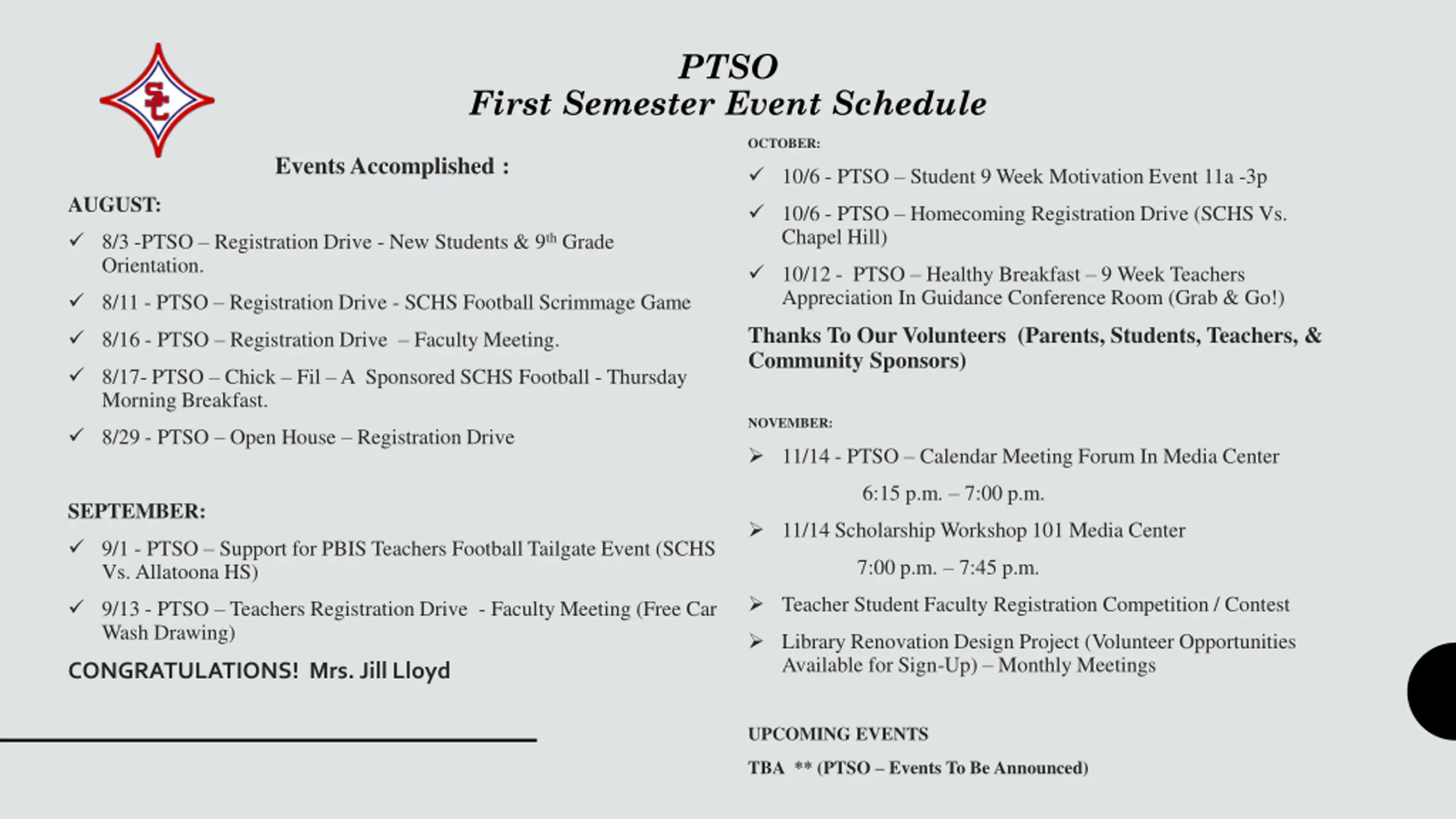 PTSO First Semester Event Schedule OCTOBER: Events Accomplished : 10/6 - PTSO Student 9 Week Motivation Event 11a -3p AUGUST: 10/6 - PTSO Homecoming Registration Drive (SCHS Vs. Chapel Hill) 8/3 -PTSO Registration Drive - New Students & 9th Grade Orientation. 10/12 - PTSO Healthy Breakfast 9 Week Teachers Appreciation In Guidance Conference Room (Grab & Go!) 8/11 - PTSO Registration Drive - SCHS Football Scrimmage Game Thanks To Our Volunteers (Parents, Students, Teachers, & Community Sponsors) 8/16 - PTSO Registration Drive Faculty Meeting. 8/17- PTSO Chick Fil A Sponsored SCHS Football - Thursday Morning Breakfast. NOVEMBER: 8/29 - PTSO Open House Registration Drive 11/14 - PTSO Calendar Meeting Forum In Media Center 6:15 p.m. 7:00 p.m. SEPTEMBER: 11/14 Scholarship Workshop 101 Media Center 9/1 - PTSO Support for PBIS Teachers Football Tailgate Event (SCHS Vs. Allatoona HS) 7:00 p.m. 7:45 p.m. Teacher Student Faculty Registration Competition / Contest 9/13 - PTSO Teachers Registration Drive - Faculty Meeting (Free Car Wash Drawing) Library Renovation Design Project (Volunteer Opportunities Available for Sign-Up) Monthly Meetings CONGRATULATIONS! Mrs. Jill Lloyd UPCOMING EVENTS TBA** (PTSO Events To Be Announced)