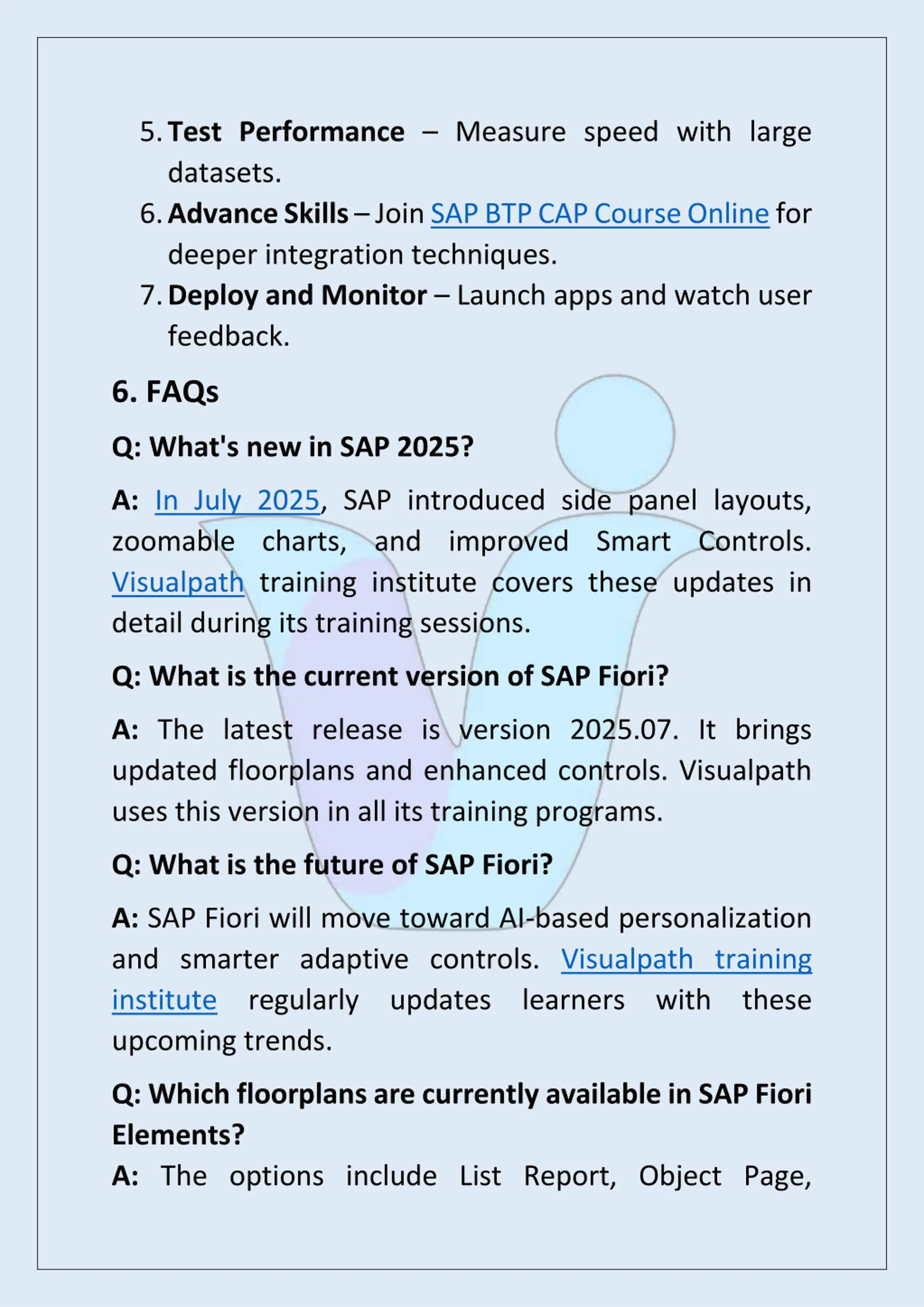 5.Test Performance Measure speed with large datasets. 6.Advance Skills Join SAP BTP CAP Course Online for deeper integration techniques. 7.Deploy and Monitor Launch apps and watch user feedback. 6. FAQs Q: What's new in SAP 2025? A: In July 2025, SAP introduced side panel layouts, zoomable charts, and improved Smart Controls. Visualpath training institute covers these updates in detail during its training sessions. Q: What is the current version of SAP Fiori? A: The latest release is version 2025.07. It brings updated floorplans and enhanced controls. Visualpath uses this version in all its training programs. Q: What is the future of SAP Fiori? A: SAP Fiori will move toward AI-based personalization and smarter adaptive controls. Visualpath training institute regularly updates learners with these upcoming trends. Q: Which floorplans are currently available in SAP Fiori Elements? A: The options include List Report, Object Page,