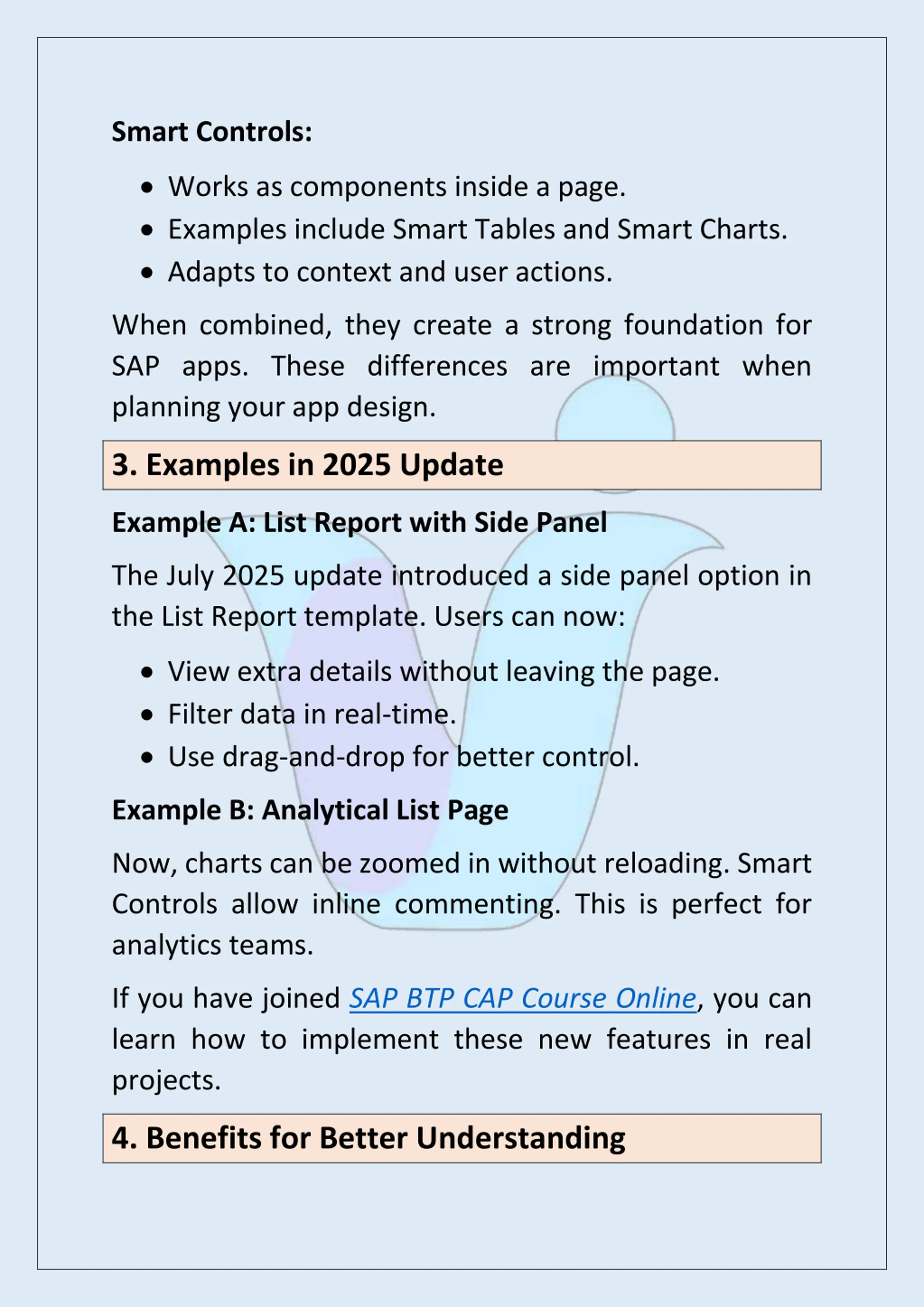 Smart Controls: Works as components inside a page. Examples include Smart Tables and Smart Charts. Adapts to context and user actions. When combined, they create a strong foundation for SAP apps. These differences are important when planning your app design. 3. Examples in 2025 Update Example A: List Report with Side Panel The July 2025 update introduced a side panel option in the List Report template. Users can now: View extra details without leaving the page. Filter data in real-time. Use drag-and-drop for better control. Example B: Analytical List Page Now, charts can be zoomed in without reloading. Smart Controls allow inline commenting. This is perfect for analytics teams. If you have joined SAP BTP CAP Course Online, you can learn how to implement these new features in real projects. 4. Benefits for Better Understanding